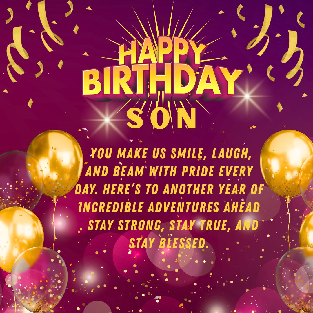 These “Birthday wishes of son” feature a heartfelt birthday greeting set against a stunning maroon gradient background adorned with festive birthday celebration decorations and elegant golden balloons. The text “Happy Birthday Son” is beautifully displayed, capturing the love and pride felt on this special day. Complementing the design is a touching birthday wish for a son: “You make us smile, laugh, and beam with pride every day. Here’s to another year of incredible adventures ahead. Stay strong, stay true, and stay blessed.” This image blends warmth, celebration, and emotional connection, making it a perfect way to honor a beloved son’s birthday.