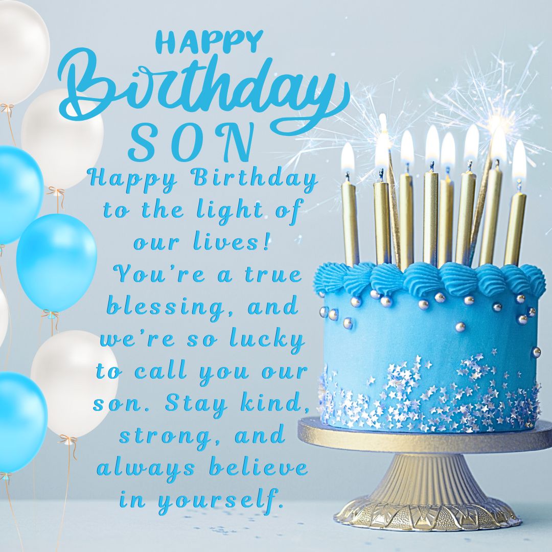 This Happy Birthday Son image showcases a charming and festive design featuring a beautifully decorated blue cake with golden candles, paired with a delightful cluster of white and blue balloons on one side. The bold text “Happy Birthday Son” stands out prominently, adding to the celebratory mood. Accompanying the visuals is a heartwarming birthday wish: “Happy Birthday to the light of our lives! You’re a true blessing, and we’re so lucky to call you our son. Stay kind, strong, and always believe in yourself.” This design perfectly captures love, pride, and joy—making it an ideal greeting to honor your son’s special day.