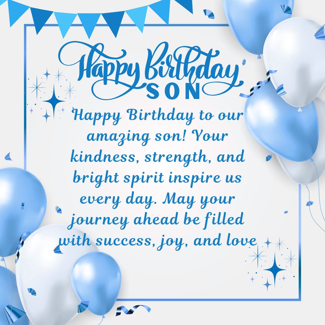 These Birthday Wishes for Son feature a charming and festive design set against a vibrant blue background filled with cheerful blue and white balloons and classic birthday decorations. At the center of the image is a light blue frame that draws attention to the heartwarming message, with “Happy Birthday” written in a cute, playful font. The birthday wish reads: “To our beloved son, On your birthday, we want you to know how deeply loved you are. May your heart always be full, and your path always blessed.” This design beautifully captures the joy and affection parents feel for their son, making it a touching and visually delightful way to celebrate his special day.