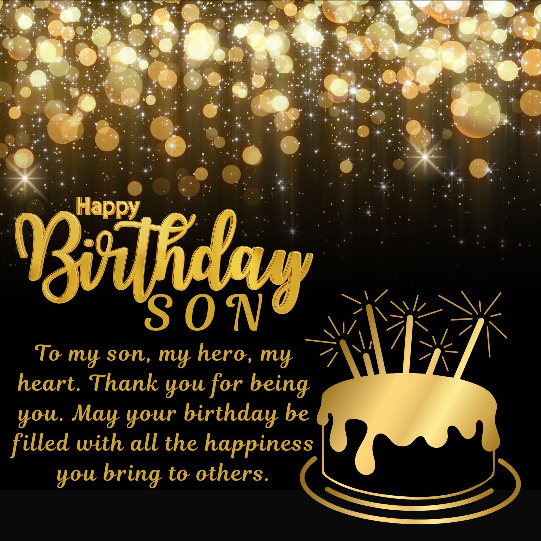 These “Happy Birthday Wishes Son” feature a striking and elegant design, showcasing an illustration of a golden birthday cake topped with golden candles, set against a luxurious black and gold background. The rich color scheme adds a sense of warmth and celebration, making the greeting visually captivating. Bold Happy Birthday wishes are highlighted, accompanied by a heartfelt message: “To my son, my hero, my heart. Thank you for being you. May your birthday be filled with all the happiness you bring to others.” This design perfectly blends style and sentiment, making it an ideal choice to honor your son’s special day with love and admiration.