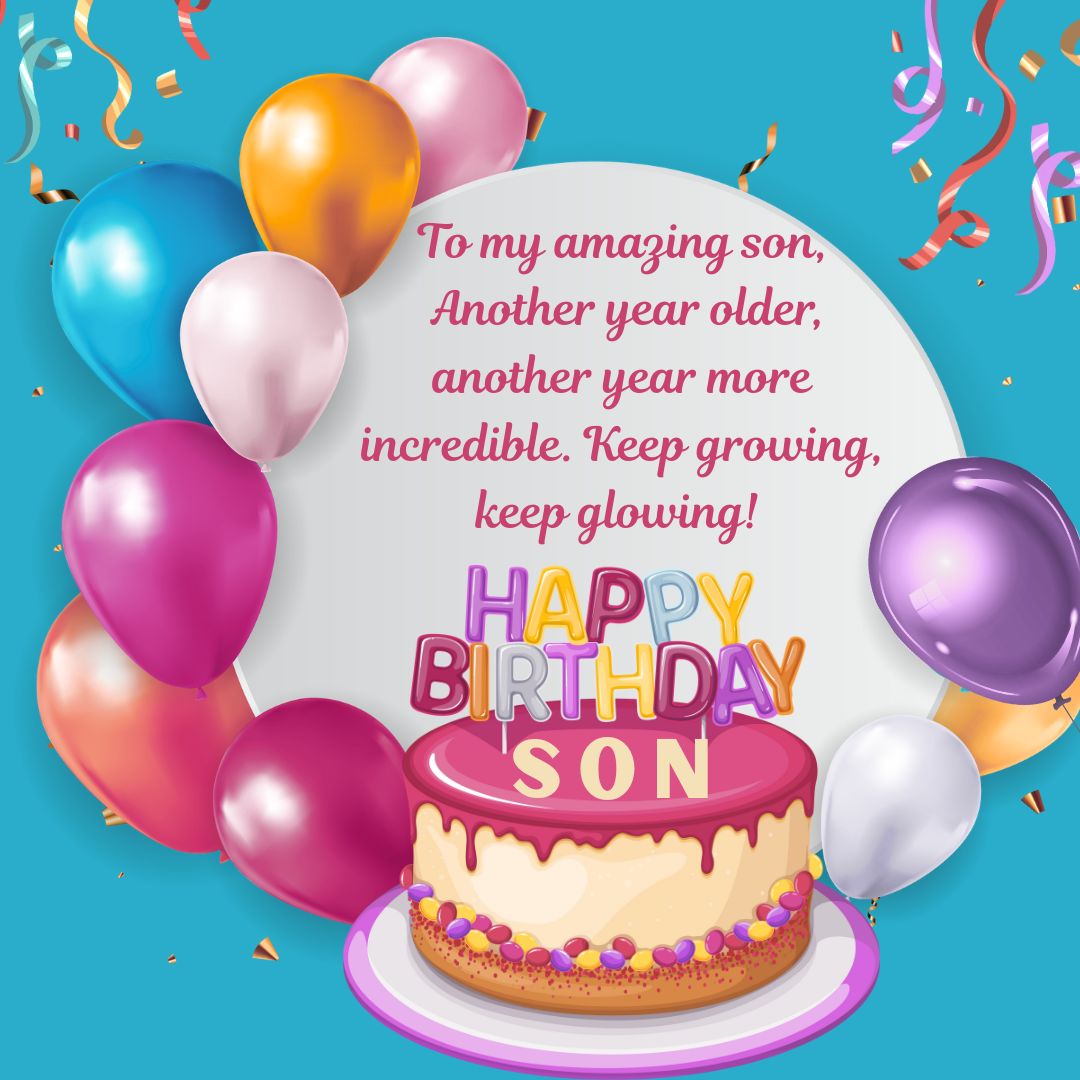 This vibrant and cheerful birthday greeting is designed with colorful “Happy Birthday words for son” that perfectly express love and pride. The image features a festive arrangement of colorful balloons surrounding a white circular frame set against a joyful blue background, creating a bright and celebratory atmosphere. At the heart of the design is a colorful birthday cake adorned with the message “Happy Birthday Son”, surrounded by classic birthday celebration decorations. The heartfelt birthday wish reads: “To my amazing son, another year older, another year more incredible. Keep growing, keep glowing!”—a perfect blend of warmth, encouragement, and celebration for a son’s special day.