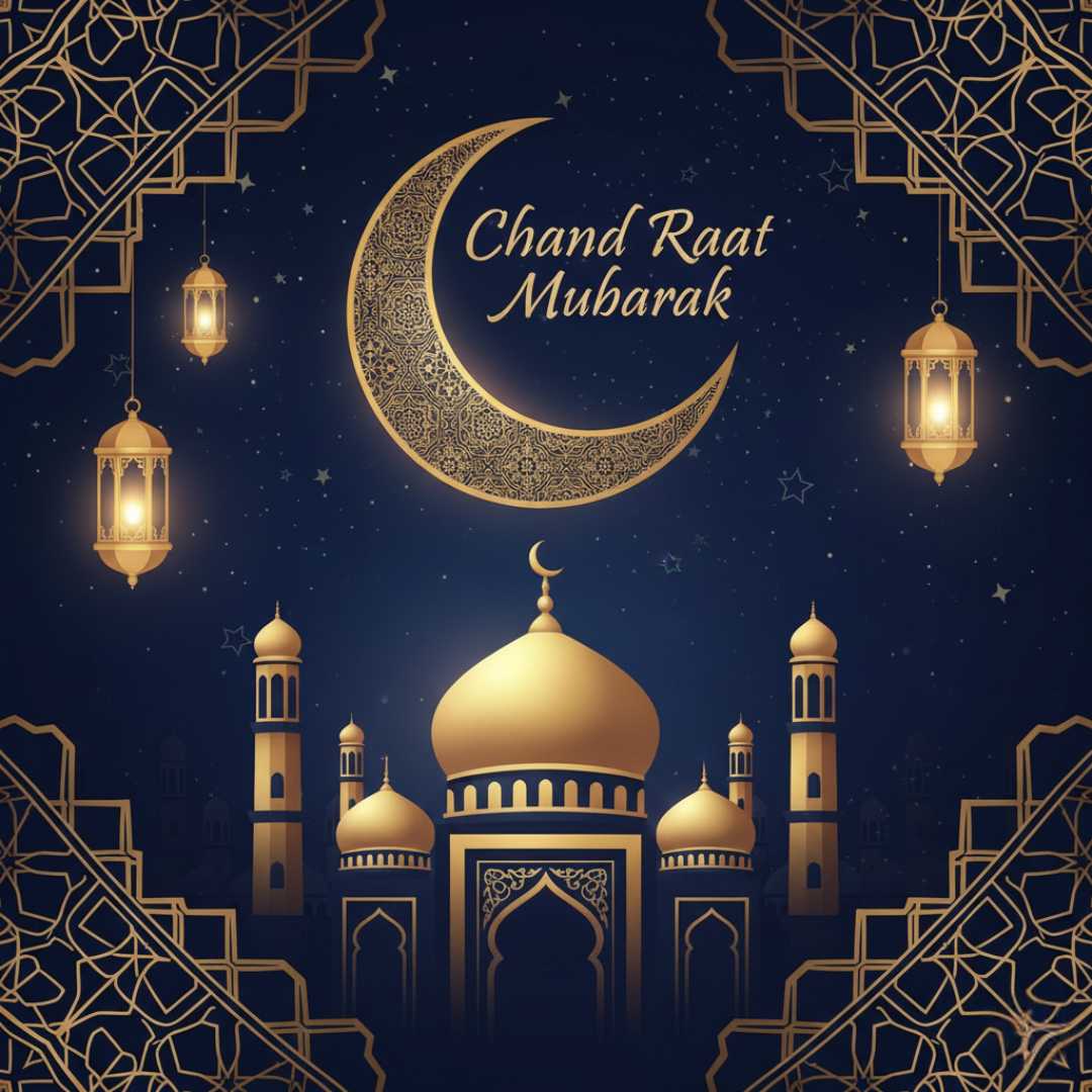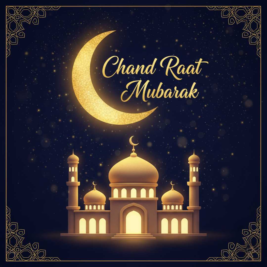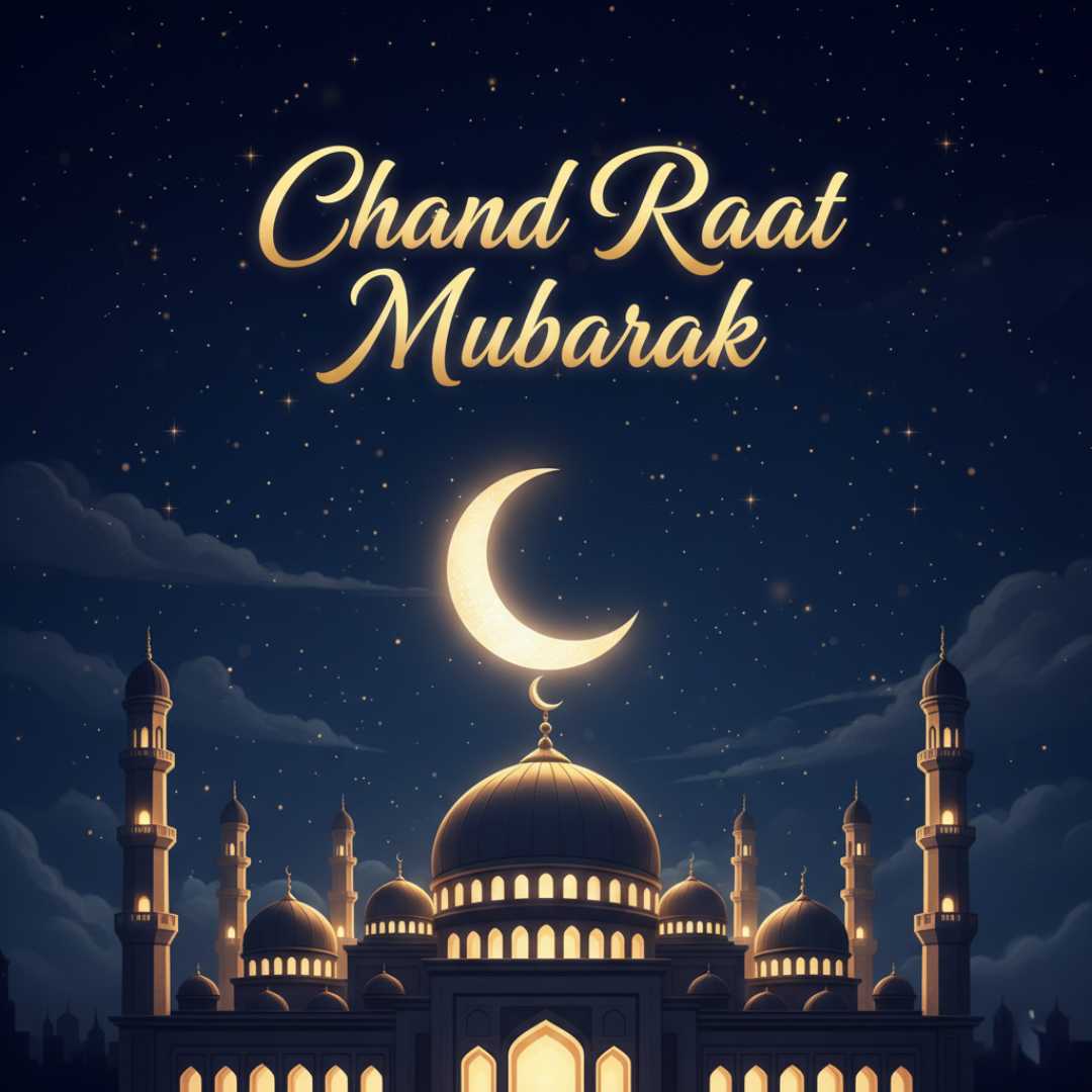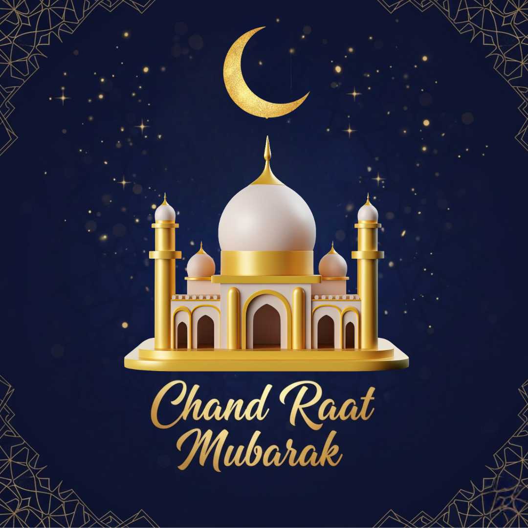 A decorative crescent moon with a glowing mosque shines against a deep blue . Twinkling stars and Islamic patterns create a festive feel. “Chand Raat Mubarak” greetings in a stylish font add warmth, while the stylish font enhance the design, perfect for social media and greeting cards.