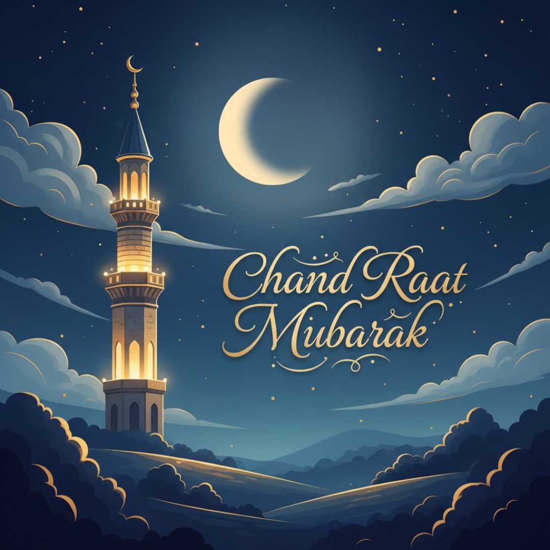 The Chand Raat Mubarak image features a stunning mosque minar, soft drifting clouds, and a radiant full moon, creating a peaceful and spiritual ambiance. The elegant “Chand Raat Mubarak” text adds a festive touch, perfect for celebrating the arrival of Eid 2026 with loved ones.