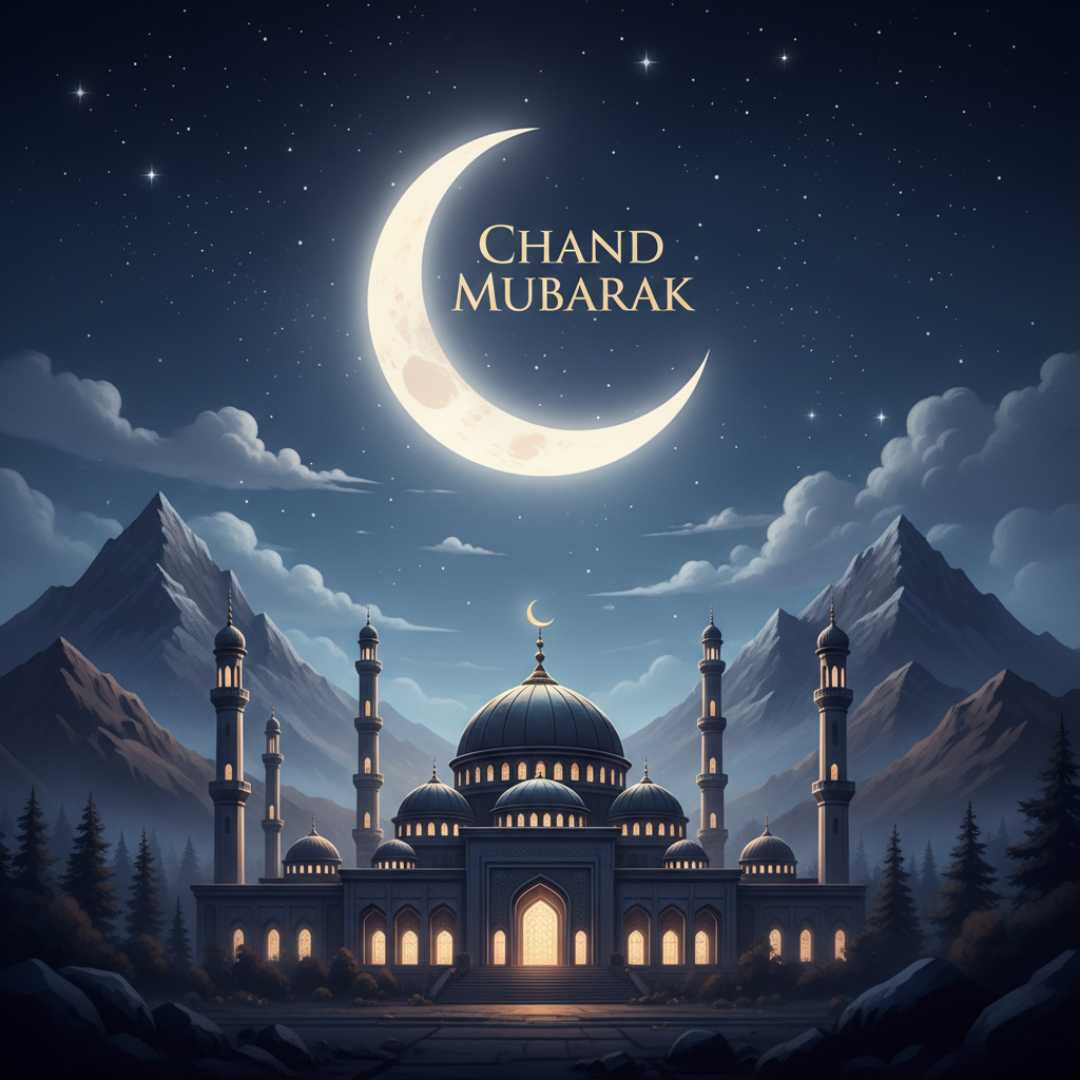 The Chand Mubarak image showcases a breathtaking mosque set against a backdrop of majestic mountains, with a glowing crescent moon in the night sky. This serene and artistic composition represents peace, spirituality, and the beauty of Chand Raat, making it a perfect visual for sharing Eid wishes and blessings.
