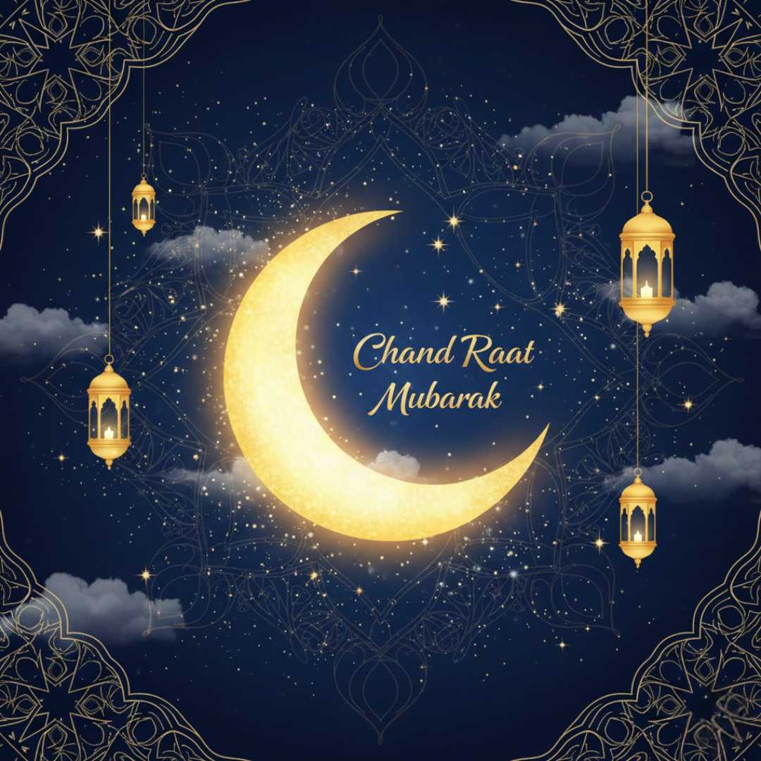 This Chand Raat greetings features a glowing crescent moon shining brightly in a deep, starry night sky, symbolizing the arrival of Eid and the end of Ramadan. Intricate Islamic decorations, elegant geometric patterns, and soft golden accents create a warm, peaceful, and festive atmosphere—perfect for sharing heartfelt Chand Raat wishes with loved ones.