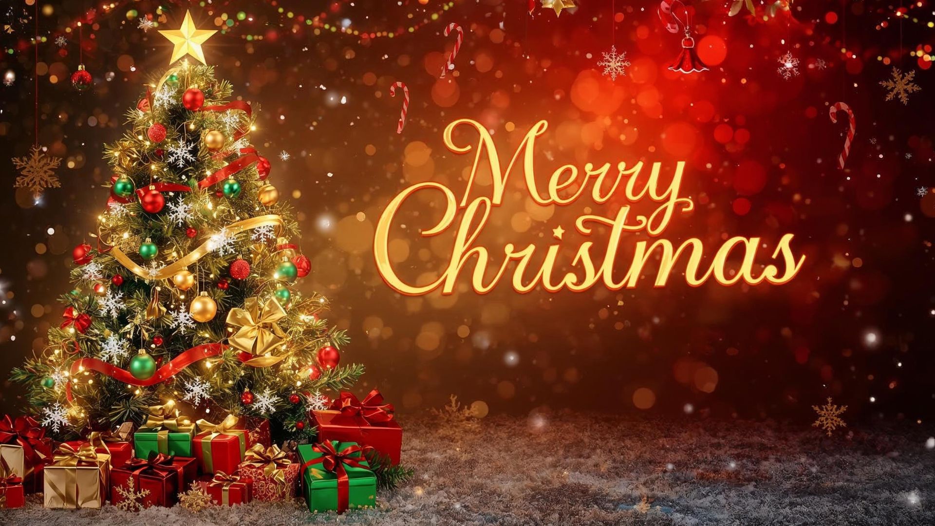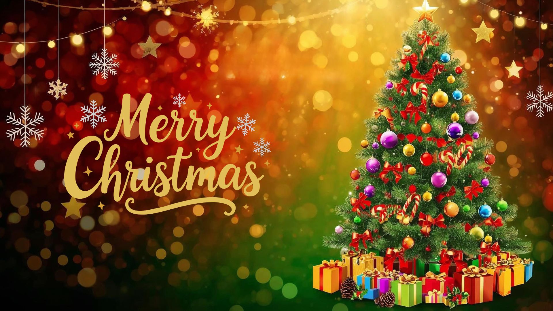 This Merry Christmas desktop wallpaper features a beautifully decorated Christmas tree as the centerpiece, adorned with glowing fairy lights, golden stars, red ribbons, ornaments, and holiday baubles. Surrounding the tree are elegantly wrapped gifts in red, green, and gold, adding to the festive charm. The greeting “Merry Christmas” is displayed in a stylish, elegant font that glows warmly and blends seamlessly with the design. The background combines deep red, forest green, and golden tones, enhanced with soft glowing lights, sparkles, snowflakes, and subtle bokeh effects. Additional Christmas decorations like pine leaves, candy canes, hanging ornaments, and stars complete the scene. The overall composition is joyful, bright, magical, and festive, creating a polished and vibrant holiday atmosphere.