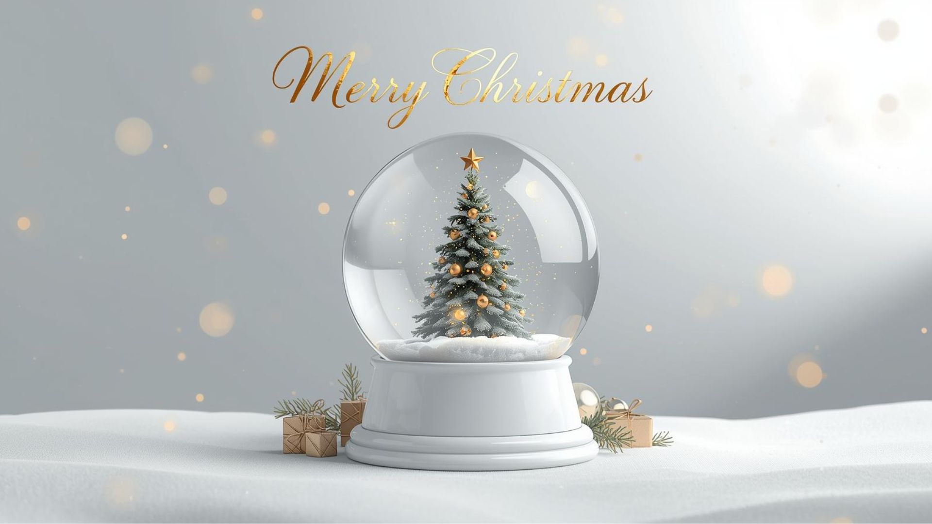 This Merry Christmas desktop wallpaper features a large, elegant snow globe at the center, containing a beautifully decorated Christmas tree with warm lights, golden ornaments, and a star topper. Delicate snow swirls inside the globe, reflecting light softly. The minimal background features a smooth gradient in silver, white, and pastel blue with subtle bokeh sparkles, creating a clean and stylish look. The greeting “Merry Christmas” appears in modern calligraphy with gold foil or soft glowing accents. Small decorative elements like gold stars, wrapped gifts, and pine leaves add charm, while maintaining a polished, luxurious, and uncluttered design.