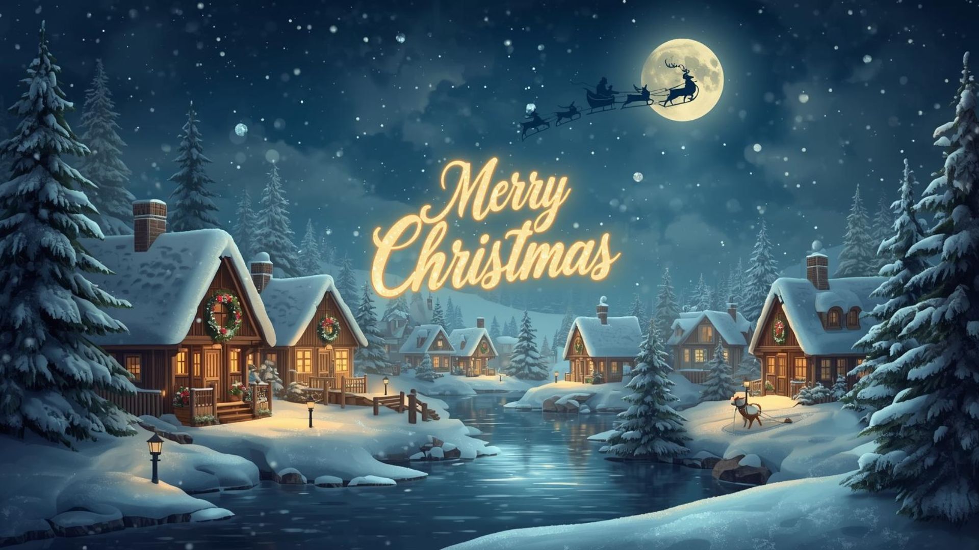 This Merry Christmas desktop wallpaper depicts a peaceful, snow-covered village at night with cozy wooden houses adorned with glowing lights, wreaths, and snowy rooftops. A softly illuminated “Merry Christmas” in magical calligraphy floats in the sky, while gently falling snowflakes add a whimsical touch. Santa’s sleigh and reindeer fly across a dreamy moonlit sky, and the scene is complemented by snow-covered pine trees, lanterns, and a small frozen lake reflecting warm lights. The color palette combines cool winter blues, soft whites, and golden glows, creating a calm, cozy, and storybook-like festive atmosphere.