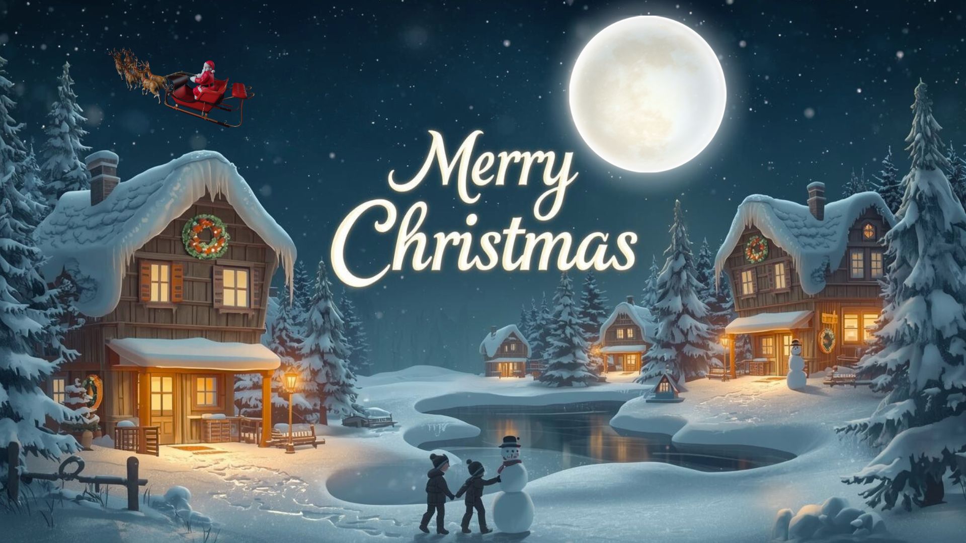 This Merry Christmas desktop wallpaper depicts a peaceful, snow-covered village at night, with cozy houses glowing warmly and adorned with festive wreaths and lights. The magical “Merry Christmas” text floats in the sky as snow gently falls, while Santa’s sleigh with reindeer flies gracefully across the night sky. A large, bright white moon illuminates the scene, adding a soft glow. Near a reflective frozen lake, children are joyfully building a snowman, surrounded by snow-covered pine trees and lanterns. The color palette of cool winter blues, soft whites, and golden glows creates a cozy, whimsical, and festive holiday atmosphere.