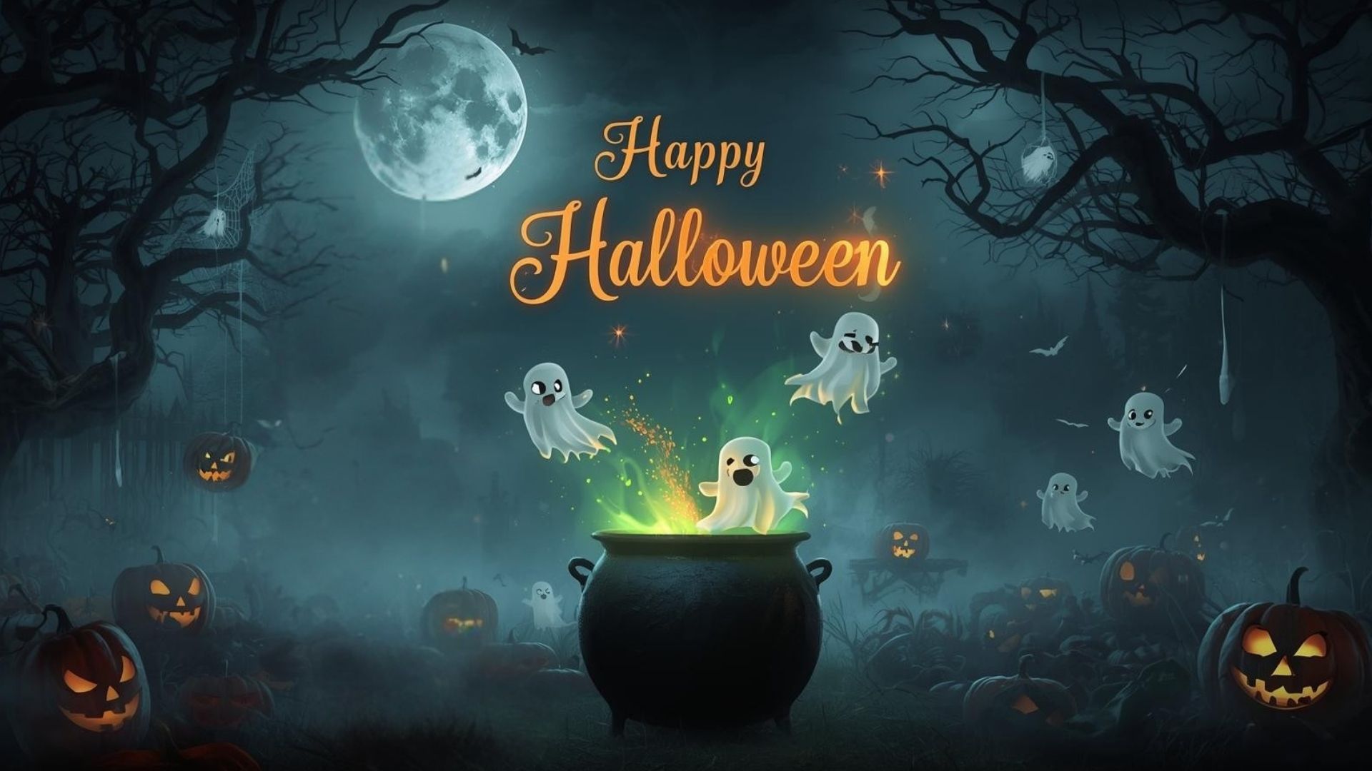 This Halloween Computer Wallpaper showcases a captivating and spooky Happy Halloween greeting glowing brightly in a dark, mysterious setting. The scene is enveloped in a smoky atmosphere beneath a glowing moon, adding an eerie yet magical vibe. On the ground, a witch’s cauldron bubbles with green smoke, filling the air with a mystical glow. Playful ghosts drift around the scene, creating a balance of fun and fright, while creepy pumpkins with glowing faces and eyes light up the surroundings. The overall design perfectly captures the festive spirit of Halloween, blending supernatural charm with a hauntingly beautiful aesthetic.