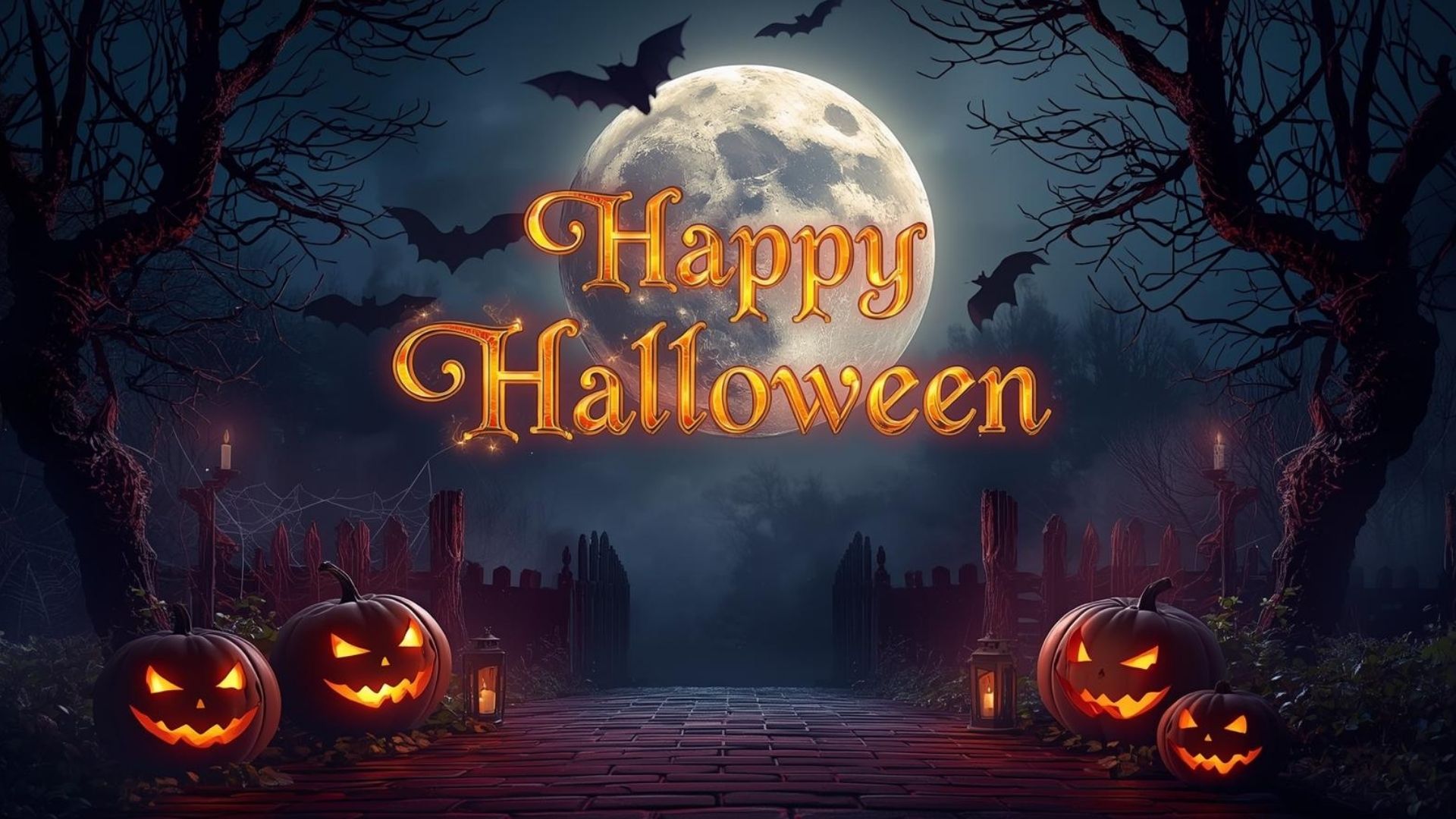 This Halloween Desktop Wallpaper presents a dark and chilling atmosphere, perfect for capturing the spirit of Halloween. The scene features a mysterious passage leading into a foggy, shadowy place, surrounded by eerie silence and dim light. A wooden railing lined with glowing candles guides the way, their flickering flames casting haunting reflections on the misty path. Around the passage stand creepy, leafless trees with twisted branches that add to the unsettling vibe. Above, a bright full moon lights up the night sky, while bats flutter around it, enhancing the spooky and suspenseful feeling of this haunting Halloween scene.