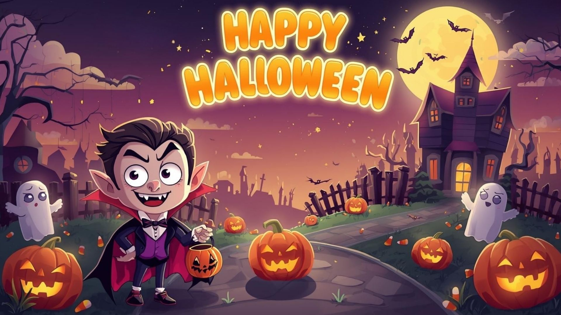 This Halloween Wallpaper Desktop showcases a cheerful yet spooky Happy Halloween scene filled with festive energy. At the center stands a playful vampire kid holding a pumpkin-shaped candy bag, ready for trick-or-treating. The street is lined with glowing jack-o’-lanterns, their faces and eyes casting an eerie but fun light into the night. Ghosts drift playfully around the scene, while a glowing full moon illuminates the sky, surrounded by bats flying in eerie motion. The design is topped with the words “Happy Halloween” written in bright, glowing text, completing this perfect blend of fun and fright for your desktop background.