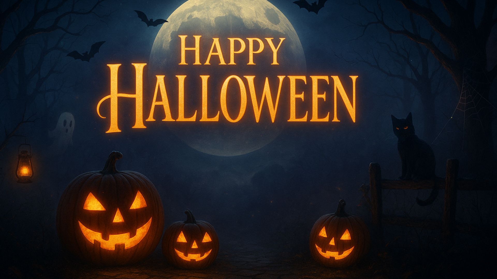 This Halloween Wallpaper Scary showcases a chilling Happy Halloween scene set in a dark, smoky atmosphere. At the center, a scary black cat lurks with glowing eyes, while a ghost floats eerily in the background, adding to the haunting mood. The ground is decorated with pumpkins carved with glowing eyes, noses, and mouths, their light flickering like lanterns in the misty night. Above, a full moon shines through the haze as bats circle around, completing the spooky Halloween vibe. Surrounded by creepy, twisted trees, this wallpaper perfectly captures the eerie essence of Halloween night.