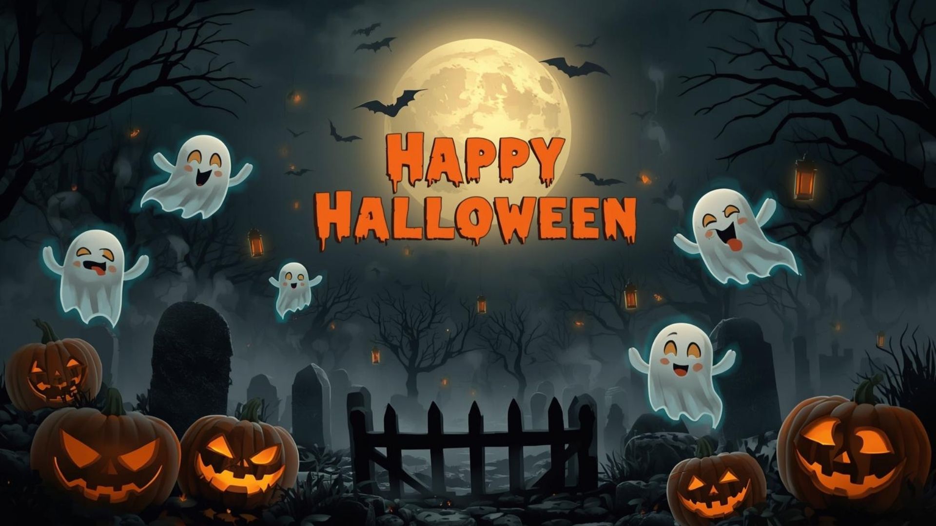 This Happy Halloween Wallpaper presents a fun yet spooky scene perfect for celebrating the Halloween spirit. The background features a misty graveyard filled with old, weathered graves and dry, twisted trees surrounded by thick fog. In the center, a funny but scary ghost appears among glowing pumpkin decorations, adding both humor and fright to the design. Above, a pale full moon lights up the eerie sky where bats fly around, while glowing paper lanterns float gently, casting a warm orange hue. The wallpaper is completed with bold “Happy Halloween” text written in a dripping blood-style orange font, making it a perfect blend of festive fun and spooky charm.