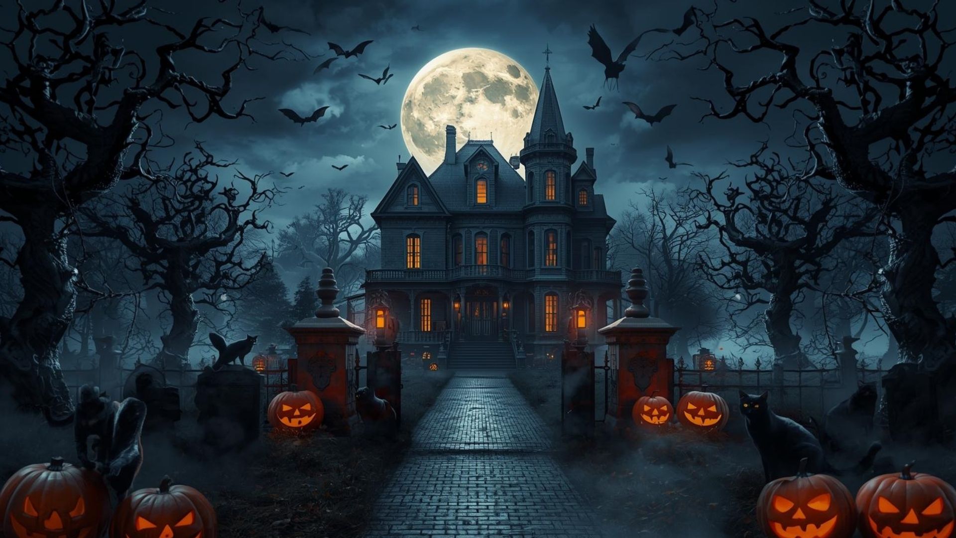 This Scary Halloween wallpaper captures a hauntingly eerie scene set in a dark, creepy place dominated by a chilling horror house. Sinister, twisted trees with frightening shapes stretch into the night sky, where bats circle beneath a glowing full moon that casts an ominous light over the landscape. The ground is decorated with glowing jack-o’-lanterns, their eerie faces flickering in the shadows, while a few menacing black cats sit nearby, adding to the spine-chilling atmosphere. The entire setting evokes a feeling of mystery and terror, making it a perfect Halloween-themed design.