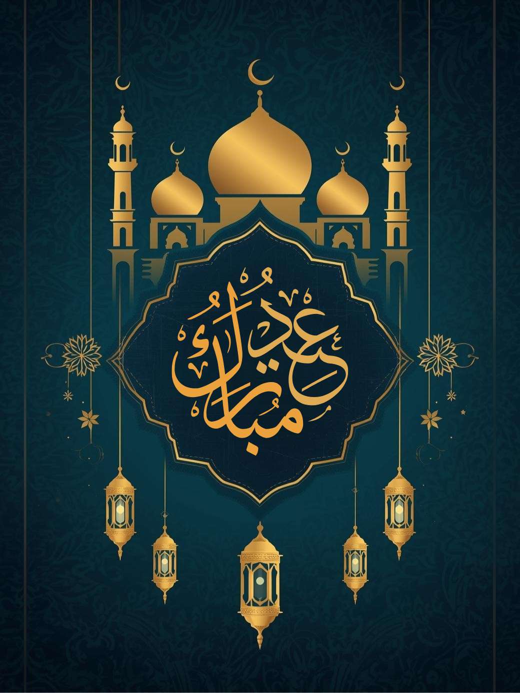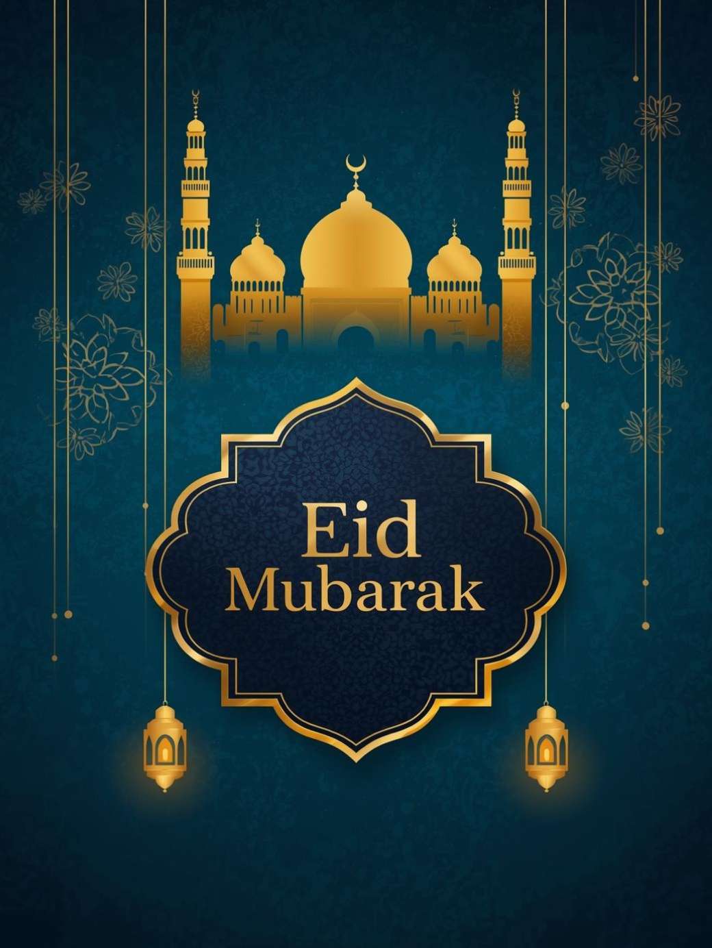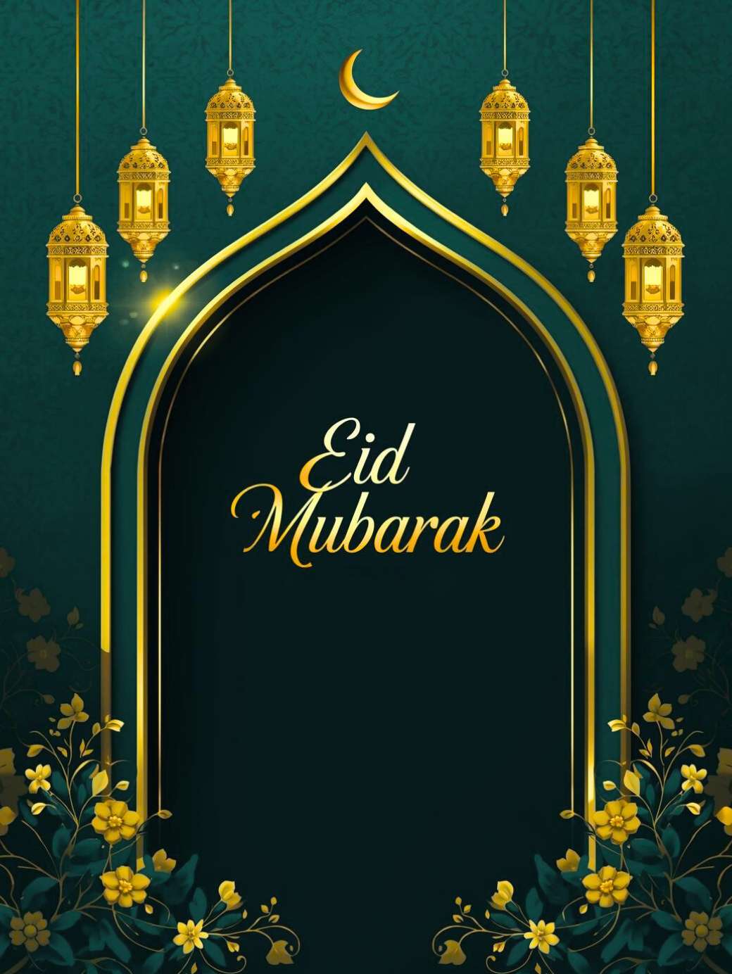 This Eid Mubarak Greetings Image shows a classy Eid Mubarak poster with a rich teal and dark green background decorated with soft Islamic patterns. A glowing gold mosque-shaped arch sits in the center, with warm golden lanterns and a small crescent moon hanging above it. Inside the arch, “Eid Mubarak” is written in elegant gold lettering, while floral details around the edges add a festive and traditional touch, making the design feel calm, beautiful, and perfect for Eid greetings.