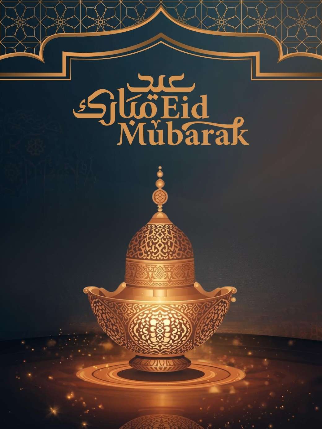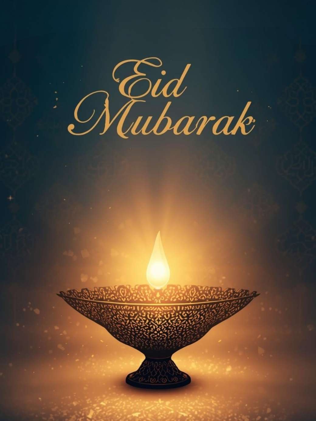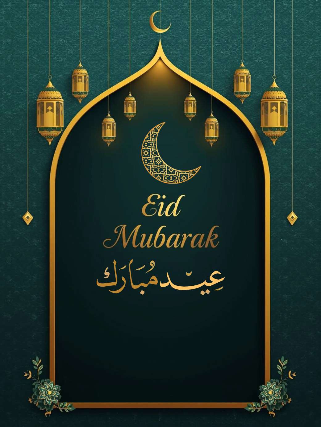 This Eid Mubarak Greetings Image shows a classy Eid Mubarak poster with a rich teal and dark green background decorated with soft Islamic patterns. A glowing gold mosque-shaped arch sits in the center, with warm golden lanterns and a small crescent moon hanging above it. Inside the arch, “Eid Mubarak” is written in elegant gold lettering, while floral details around the edges add a festive and traditional touch, making the design feel calm, beautiful, and perfect for Eid greetings.