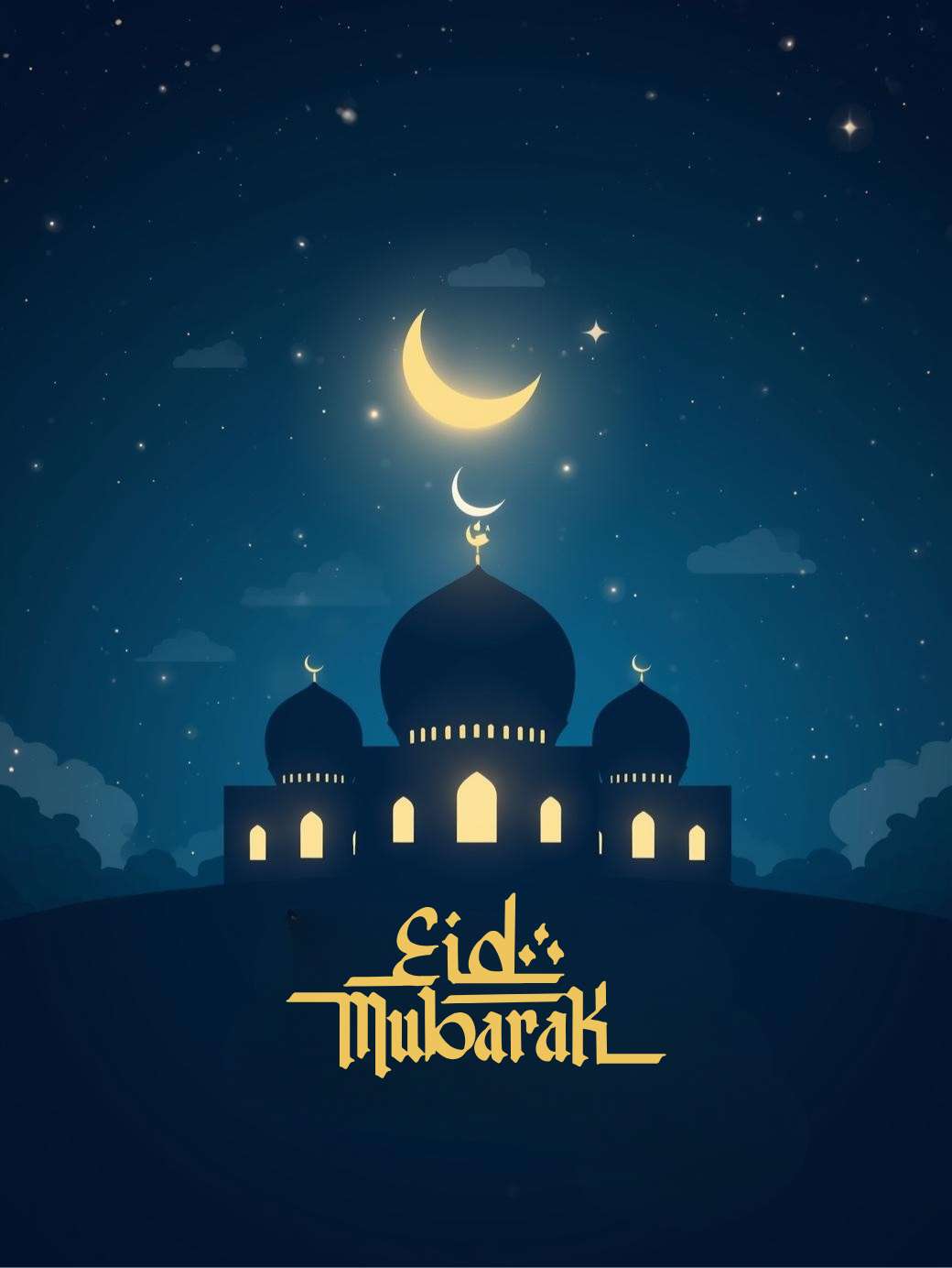 This Eid Mubarak greeting Image with featuring Eid Mubarak Night Sky captures a tranquil night with a softly illuminated mosque set against a deep blue, star-filled sky. A radiant crescent moon glows above, while twinkling stars and wispy clouds add a serene, magical feel. The words “Eid Mubarak” appear in a stylish, glowing font, creating a warm, joyful, and spiritual vibe ideal for social media post.