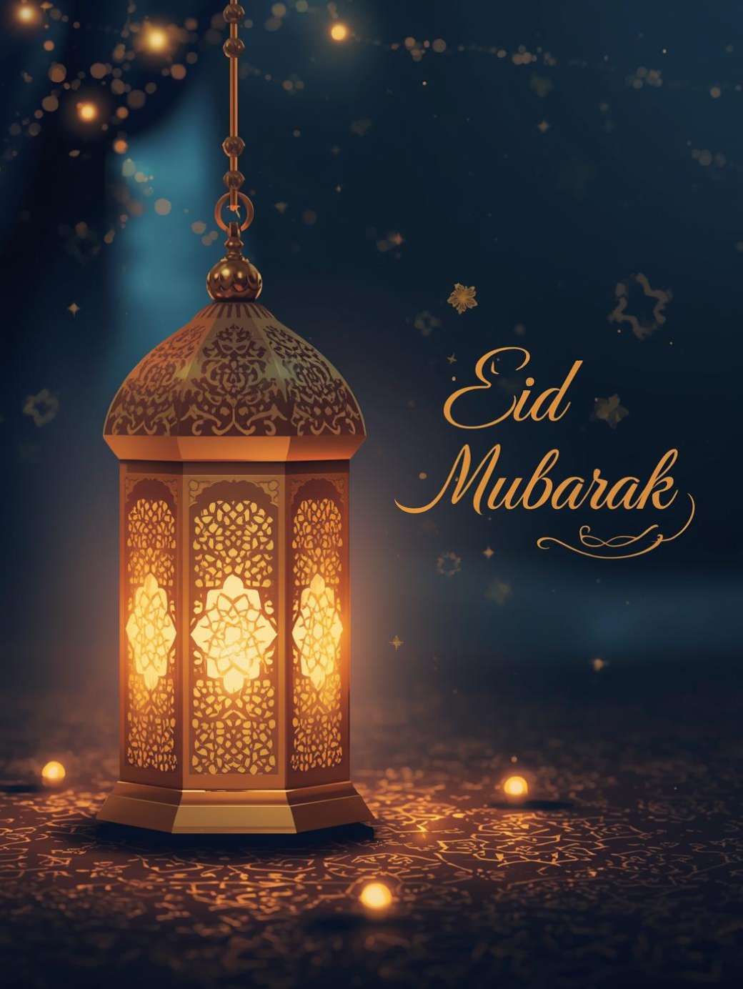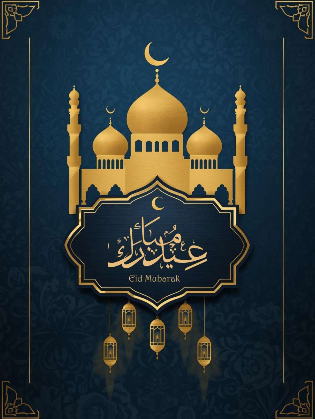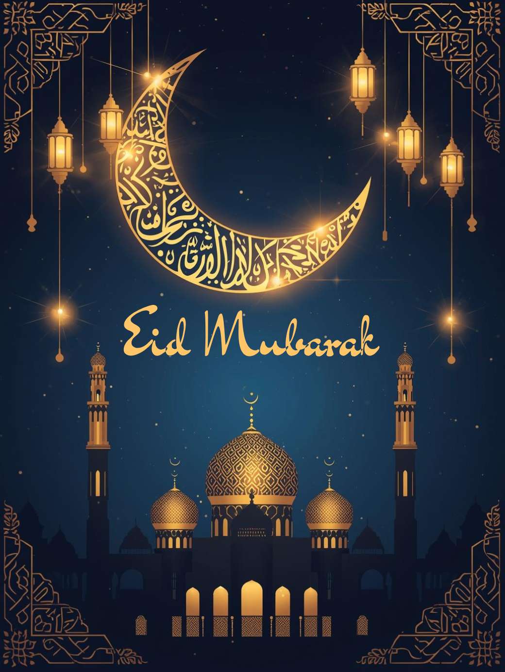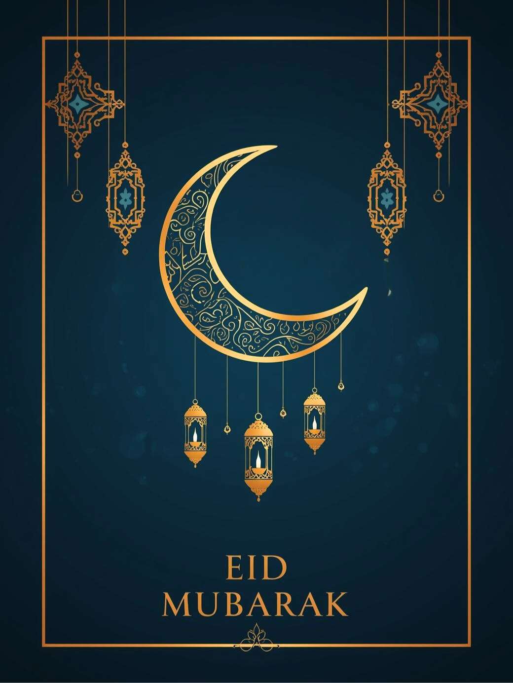 This Eid Mubarak Message features a deep navy blue background with soft bokeh and smooth gradients, creating a calm night-time feel. A large golden crescent moon is, surrounded by hanging lanterns and elegant gold floral and geometric patterns. “EID MUBARAK” is written in refined gold lettering at the bottom, completing a luxurious, festive, and balanced design perfect for greeting cards, social media, and banners.
