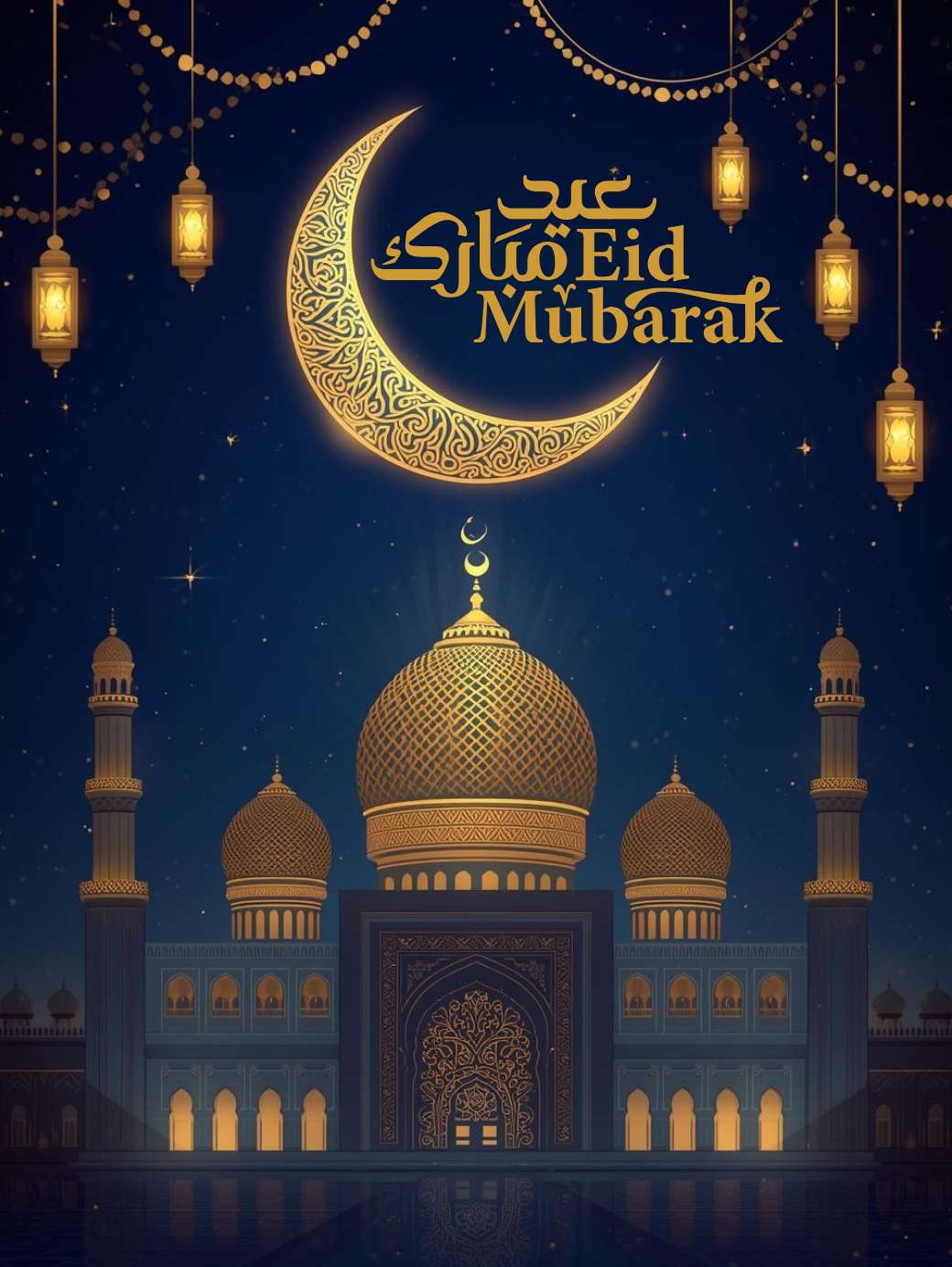 This Eid Mubarak Elegant Background features a grand mosque with a glowing golden dome and minarets set against a deep blue night sky. A beautifully decorated crescent moon with intricate Islamic patterns holds “Eid Mubarak” written elegantly in both Arabic and English along its curve. Warm lanterns, gentle sparkles, and soft light rays add a festive, peaceful, and spiritual touch, making the scene perfect for Eid greetings, social media, and celebratory backgrounds.