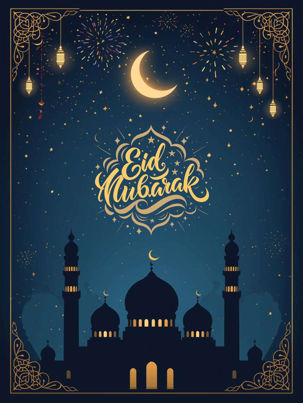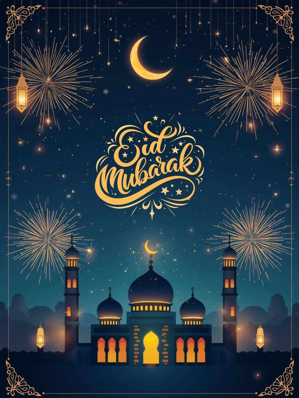 This Eid Mubarak Image shows a festive Eid Mubarak scene with a glowing crescent moon shining in a deep night-blue sky above a softly lit mosque with domes and minarets. Colorful fireworks light up the sky, while stars, gentle light effects, and subtle lanterns add a joyful and peaceful feel. Decorative Islamic patterns frame the edges, and the clear center space makes it perfect for adding Eid greetings to cards, social media posts, or festive backgrounds.