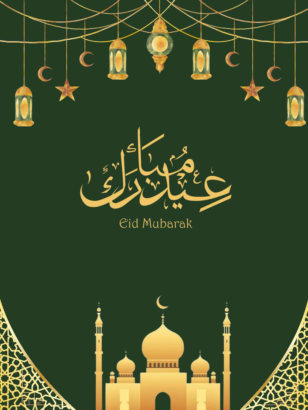 This Eid Mubarak greeting card showcases a festive green background adorned with glowing Islamic lanterns, creating a warm and celebratory atmosphere. At the center, “Eid Mubarak” is beautifully written in both Arabic and English, complemented by a golden mosque illustration and intricate golden Islamic grills at the bottom. The combination of lanterns, mosque, and decorative patterns gives the card an elegant, joyful, and spiritual feel, perfect for sharing Eid greetings with loved ones.