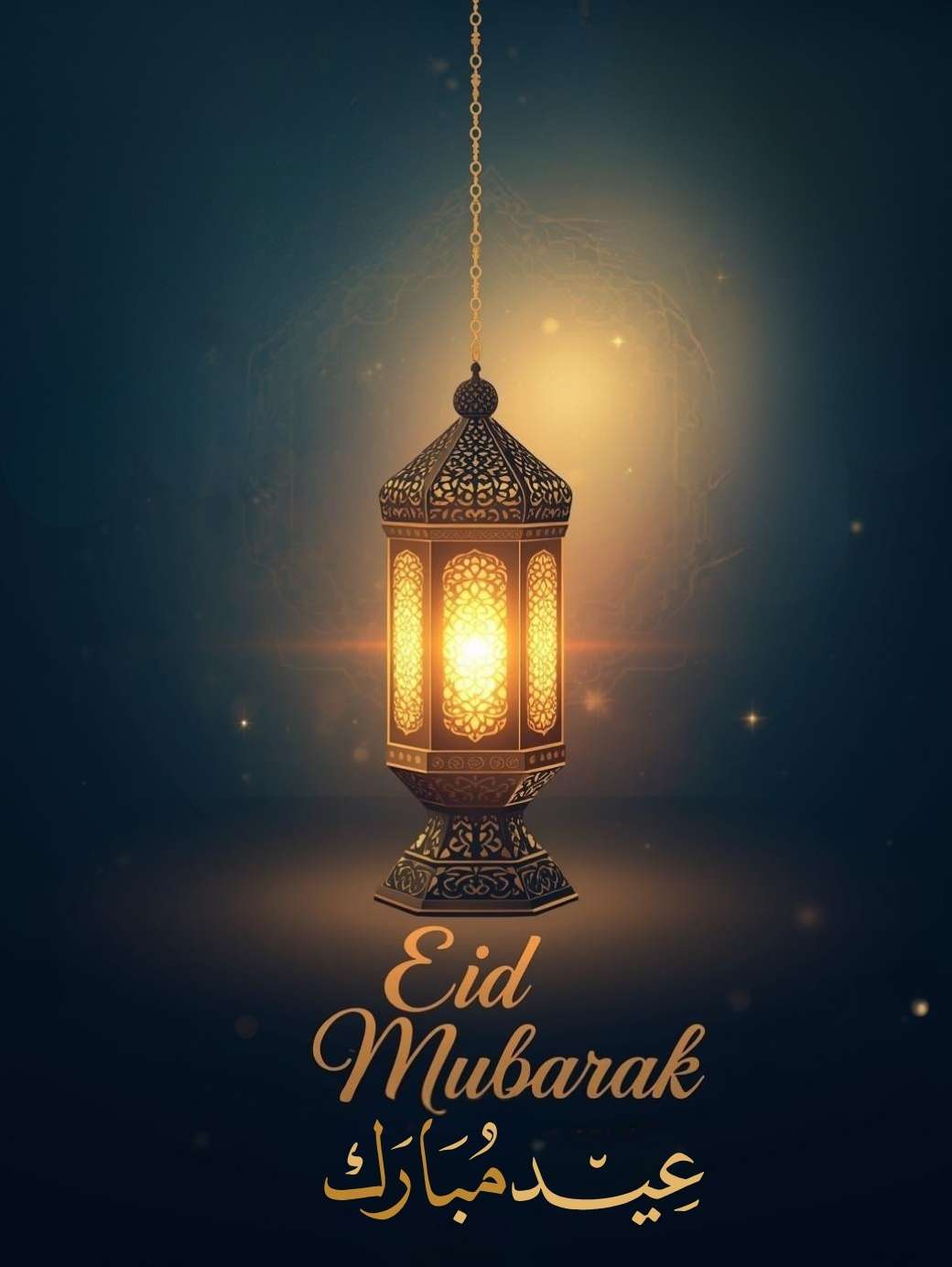 This Eid Mubarak card features a beautifully designed Islamic grille with a glowing golden lamp at the center, creating a warm and festive atmosphere. “Eid Mubarak” is written in both English and Urdu, adding a meaningful and inclusive touch. The scene is enhanced with gentle sparkles, and a calm background in deep blues and warm gold tones, giving the card an elegant, peaceful, and celebratory feel.