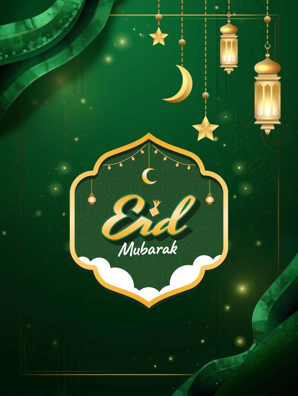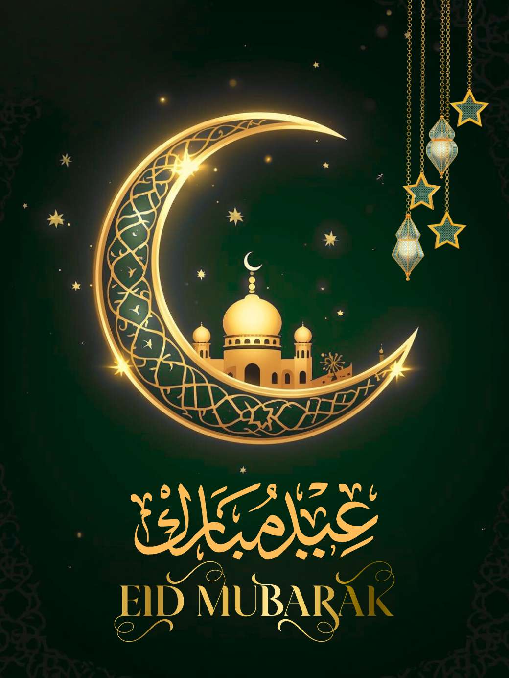 This HD Eid Mubarak image shows a rich and elegant Eid Mubarak design in deep green and gold tones, giving a calm and festive night-time feel. At the center, a beautiful golden crescent moon surrounds a softly glowing mosque, with warm lanterns hanging below to add a welcoming touch. Delicate Islamic patterns, a subtle gold frame, and “EID MUBARAK” written in elegant lettering (in English as well) complete the look, making the illustration feel luxurious, peaceful, and perfect for Eid greeting cards or social media posts.
