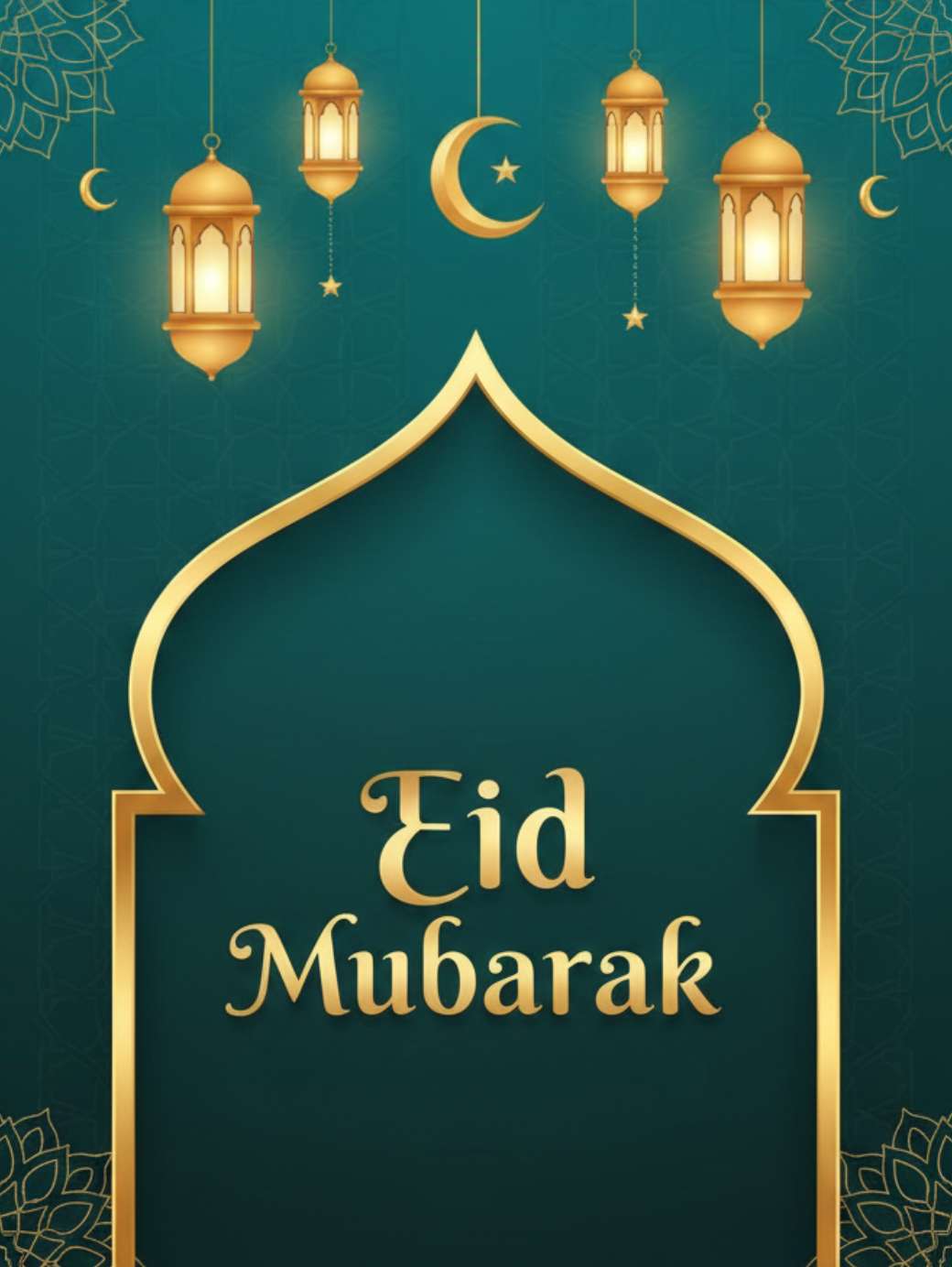This elegant Eid Mubarak illustration features a deep teal-to-dark green gradient background with subtle Islamic geometric patterns, giving it a rich and luxurious feel. A large mosque-shaped arch outlined in glowing gold takes center stage, with softly glowing lanterns, a small golden crescent moon, and hanging ornaments adding warmth above. “Eid Mubarak” is beautifully written in gold calligraphy inside the arch, while ornate floral motifs in gold and teal decorate the corners and edges, creating a festive, graceful, and welcoming design perfect for greeting cards, social media posts, and invitations.