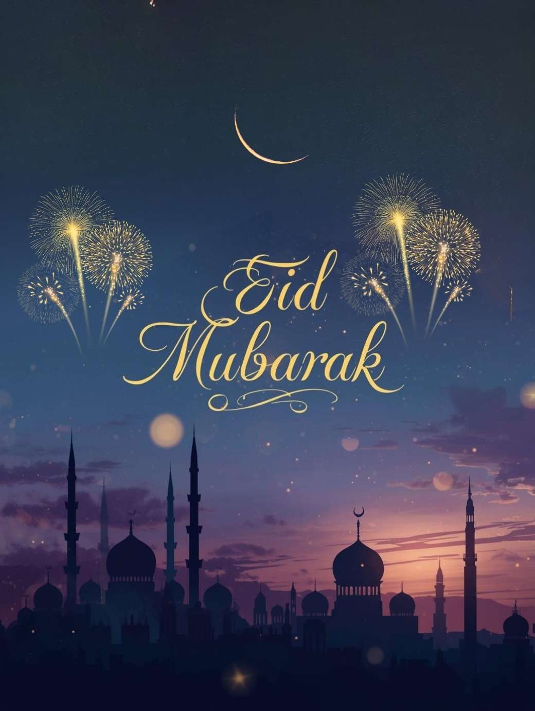 This breathtaking Eid Mubarak photo captures a magical night scene with a deep blue to purple sky filled with glowing stars, colorful fireworks, and a radiant golden crescent moon. An elegant Islamic cityscape with softly lit mosques, domes, and tall minarets forms the background, while “Eid Mubarak” is beautifully written in luxurious gold Arabic calligraphy at the center. Floating golden particles, soft sparkles, light rays, and subtle Islamic geometric patterns add warmth and depth, creating a peaceful, joyful, and celebratory atmosphere perfect for greeting cards, social media, or festive displays.