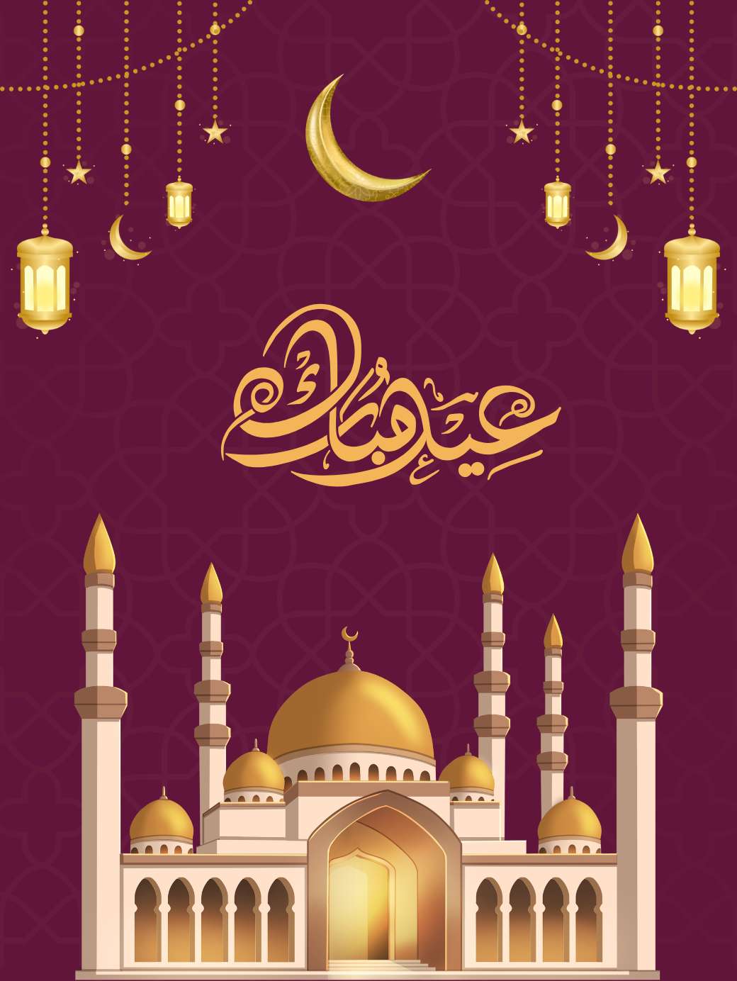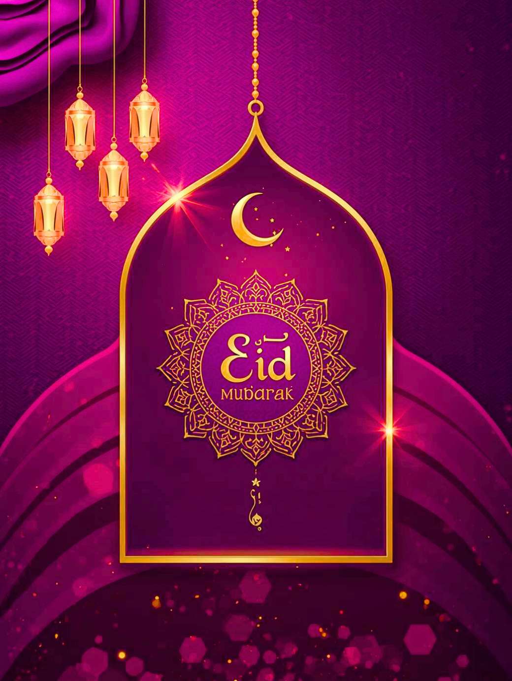 This beautiful Eid Mubarak Design features a rich purple and gold theme, with a glowing golden mosque-shaped arch at the center. Inside the arch, “Eid Mubarak” is written in elegant gold calligraphy, surrounded by a decorative mandala. A soft golden crescent moon and hanging lanterns add warmth and festivity, while subtle sparkles and Islamic patterns in the background create a calm, joyful, and celebratory Eid atmosphere.
