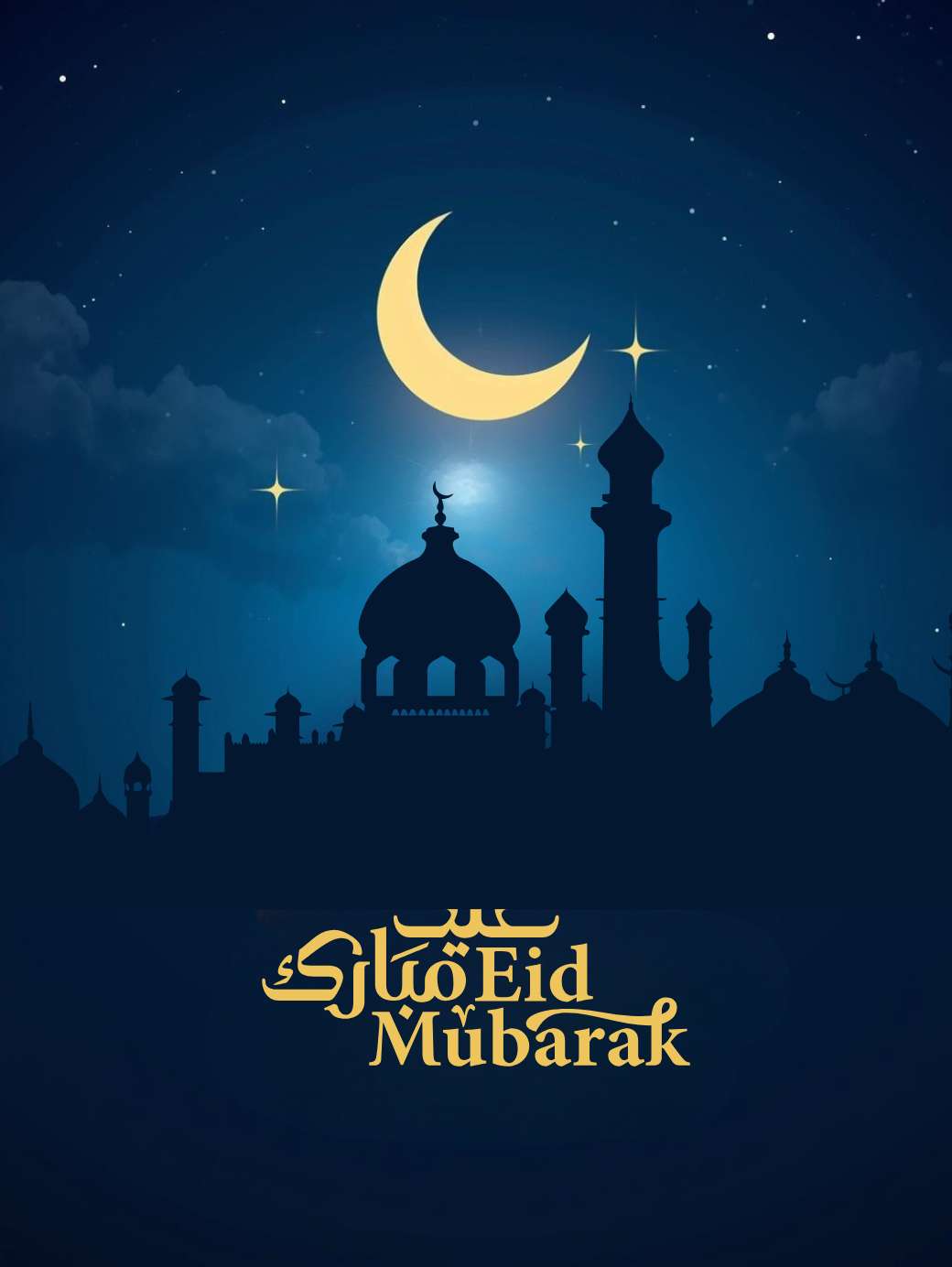 This Eid Mubarak image for social media shows a peaceful night scene with a mosque silhouette under a deep blue sky. A soft golden crescent moon and twinkling stars add a warm, festive glow, while “Eid Mubarak” is beautifully written in both English and Arabic calligraphy. The combination of the serene night sky, mosque, and golden accents creates an elegant and celebratory design perfect for sharing Eid greetings online.