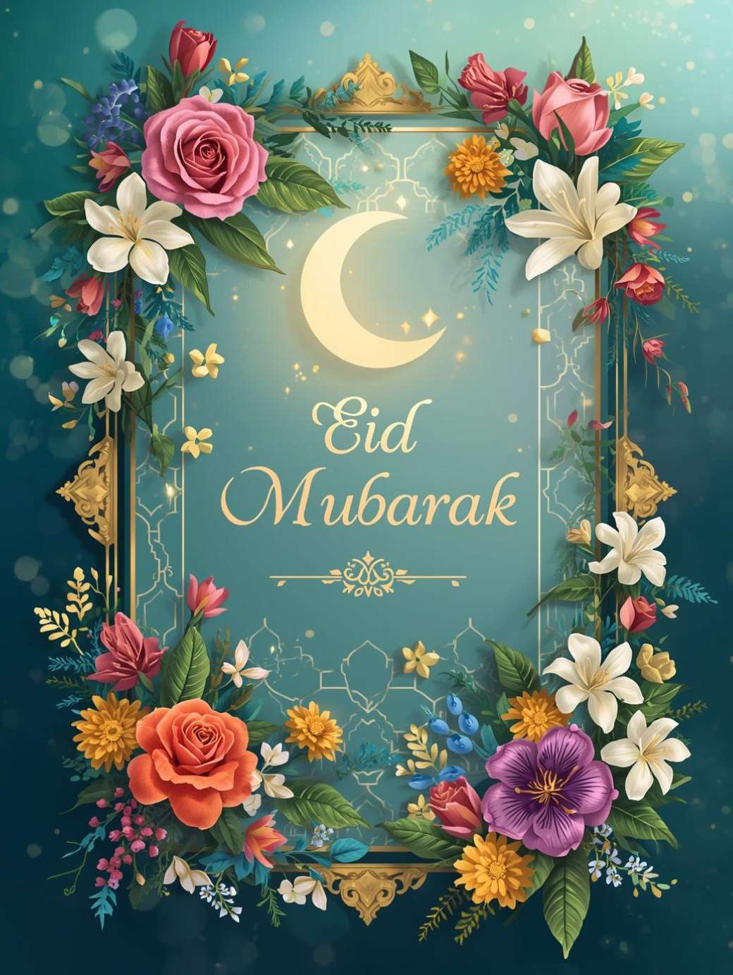 This Eid Mubarak floral design is vibrant and festive, featuring a rich teal, royal blue, or emerald green background with subtle Islamic geometric patterns for depth. The scene is framed by colorful, detailed floral arrangements including roses, lilies, jasmine, and marigolds, accented with glowing crescent moons, golden highlights, and delicate stars and vines. At the center, “Eid Mubarak” is beautifully written in elegant Arabic-inspired calligraphy or a decorative font in gold or ivory, creating a joyful, graceful, and uplifting design perfect for greeting cards, social media posts, posters, and digital invitations.