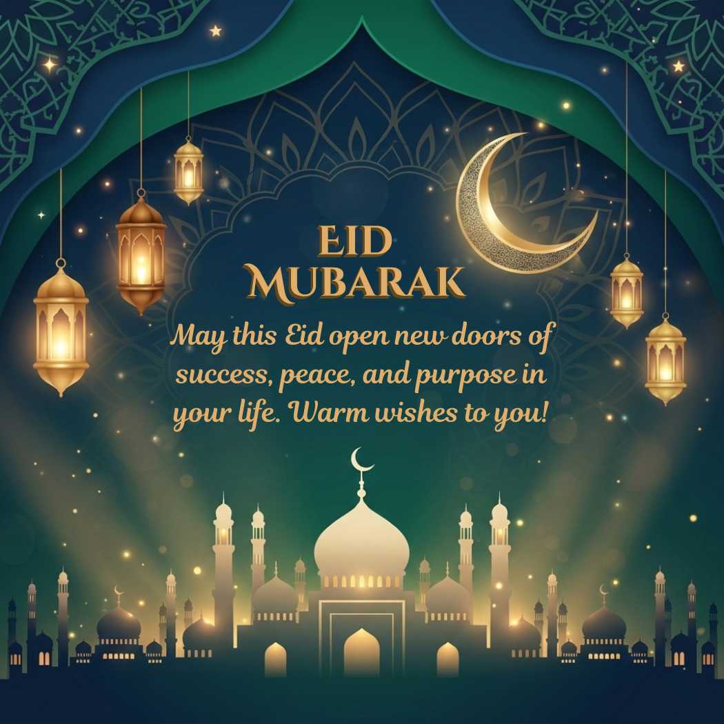 The Eid Celebration Message image shows a beautifully designed Eid greeting background with a calm and elegant festive atmosphere, featuring a glowing crescent moon, decorative lanterns, soft golden lights, and subtle Islamic geometric patterns in a harmonious palette of deep blue, emerald green, cream, and gold. At the center, the Eid Celebration Message appears: “May this Eid open new doors of success, peace, and purpose in your life. Warm wishes to you!”, enhancing the peaceful, celebratory, and timeless feel of the design.