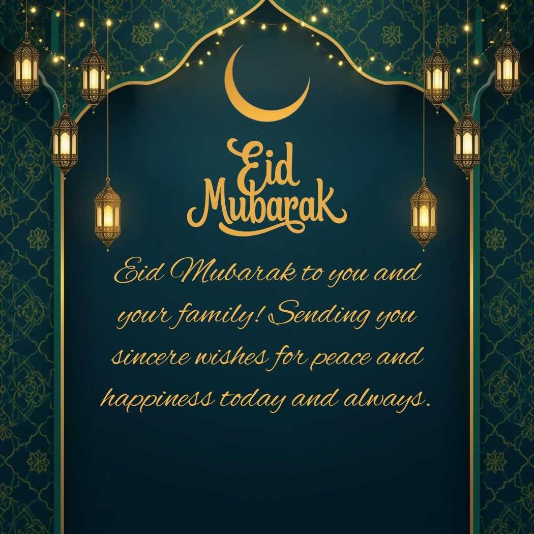 The Eid Mubarak Greeting Message shows a beautifully designed Eid greeting background with a calm and elegant festive feel. It features a glowing crescent moon, decorative lanterns, soft golden lights, and subtle Islamic geometric patterns, all in a harmonious palette of deep blue, emerald green, cream, and gold. The composition is balanced with a clear open space in the center for a message, where the warm wish appears: “Eid Mubarak to you and your family! Sending you sincere wishes for peace and happiness today and always.” The overall atmosphere is peaceful, joyful, and gracefully celebratory.