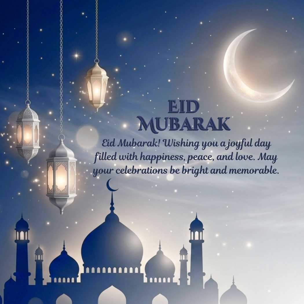 Eid Mubarak Wishes are a heartfelt way to express love, joy, and blessings to your family and friends during this cherished Islamic celebration. This beautifully designed Eid Mubarak Wishes image captures the festive spirit with glowing illuminated lanterns, symbolizing light, hope, and spiritual warmth. The design includes elegant Eid Mubarak text in both English and Urdu, making it inclusive and meaningful for a wider audience. Delicate Islamic patterns enhance the aesthetic appeal, adding a traditional touch. At the center is a warm and uplifting wish: “Wishing you and your loved ones a celebration full of smiles, sweet memories, and countless blessings.” This image perfectly blends beauty and meaning, making it ideal for sharing during Eid.