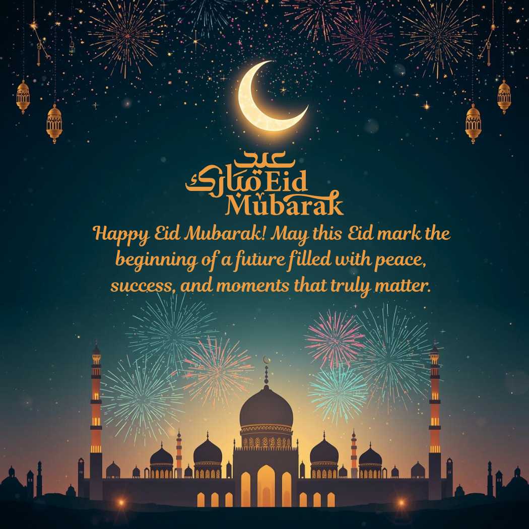 The Eid Mubarak Wishes image features a festive Eid Mubarak background with a glowing crescent moon in a deep night-blue sky, sparkling stars, and a softly illuminated mosque silhouette with domes and minarets. Colorful fireworks brighten the scene, while golden accents, lanterns, and delicate Islamic patterns add warmth and elegance around the edges. At the center, the wish appears beautifully: “Happy Eid Mubarak! May this Eid mark the beginning of a future filled with peace, success, and moments that truly matter.