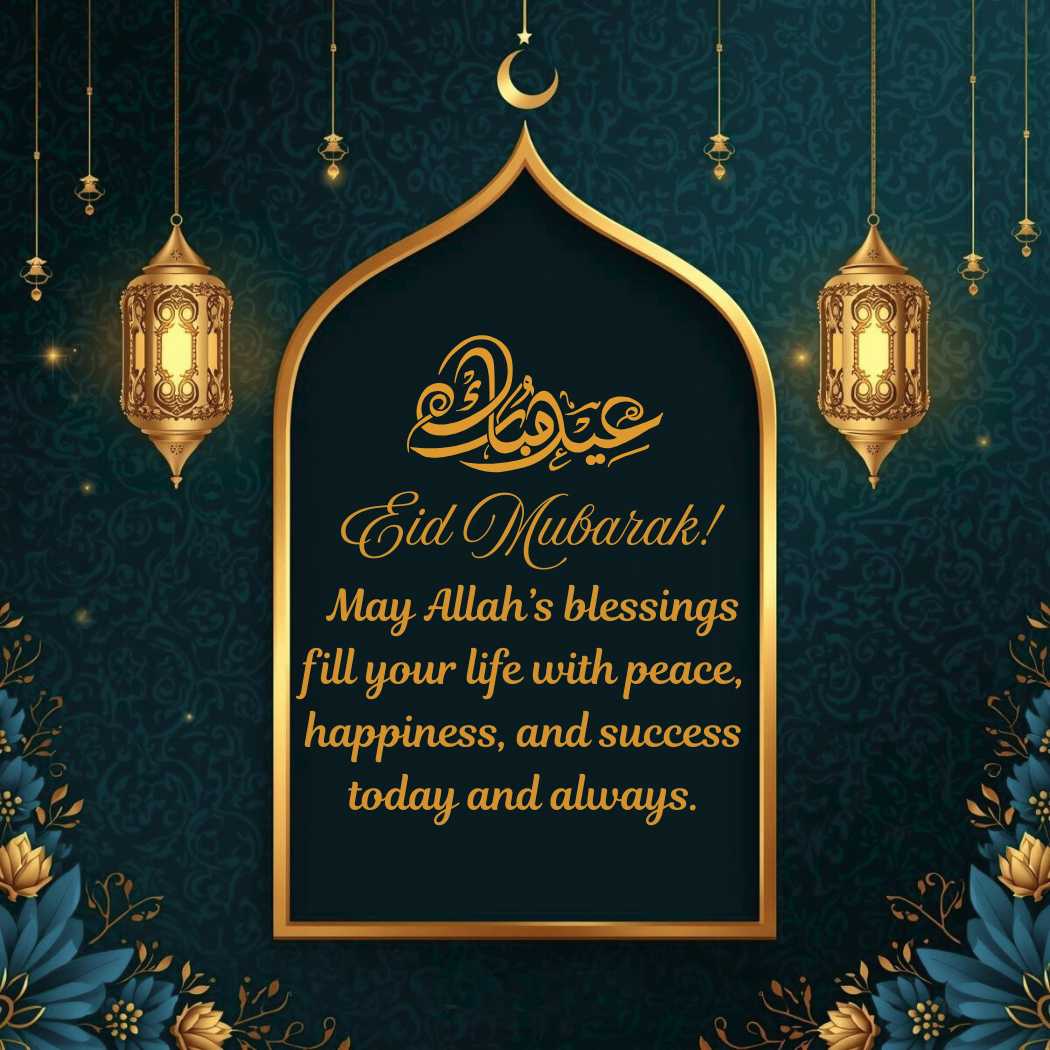 The Eid Wishes image shows a luxurious Eid Mubarak greeting in a vertical format with a deep teal and dark green gradient background, softly embossed with Islamic geometric patterns. A glowing gold mosque-arch frame and warm hanging lanterns create a graceful focal point, complemented by delicate floral motifs and a crescent moon. At the center, the wish appears beautifully: “May Allah’s blessings fill your life with peace, happiness, and success today and always.”