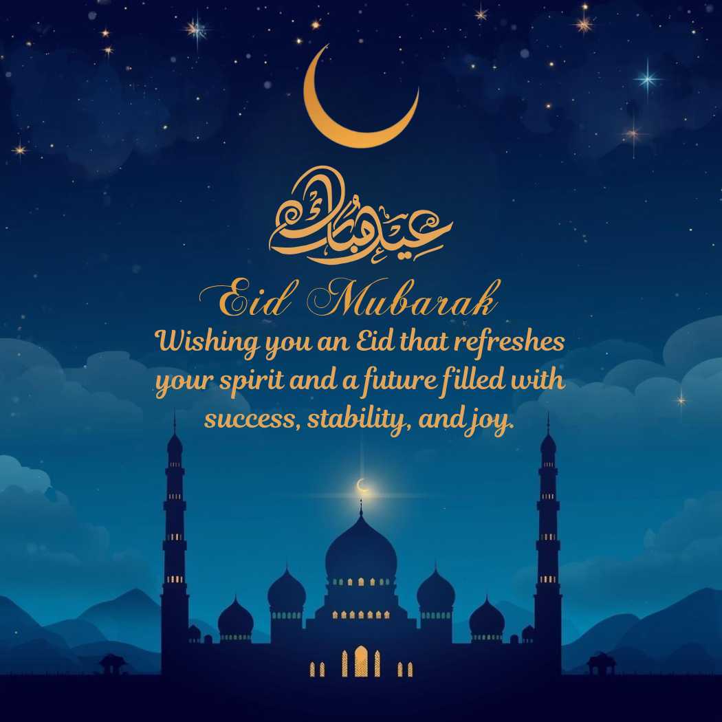 The General Eid Greetings image shows a serene and festive scene with a softly glowing mosque set beneath a deep blue, star-filled night sky. A radiant crescent moon shines above, surrounded by twinkling stars, gentle clouds, and subtle light effects that create a calm and spiritual atmosphere. The overall mood feels peaceful and celebratory, and at the center the warm wish appears: “Wishing you an Eid that refreshes your spirit and a future filled with success, stability, and joy.”
