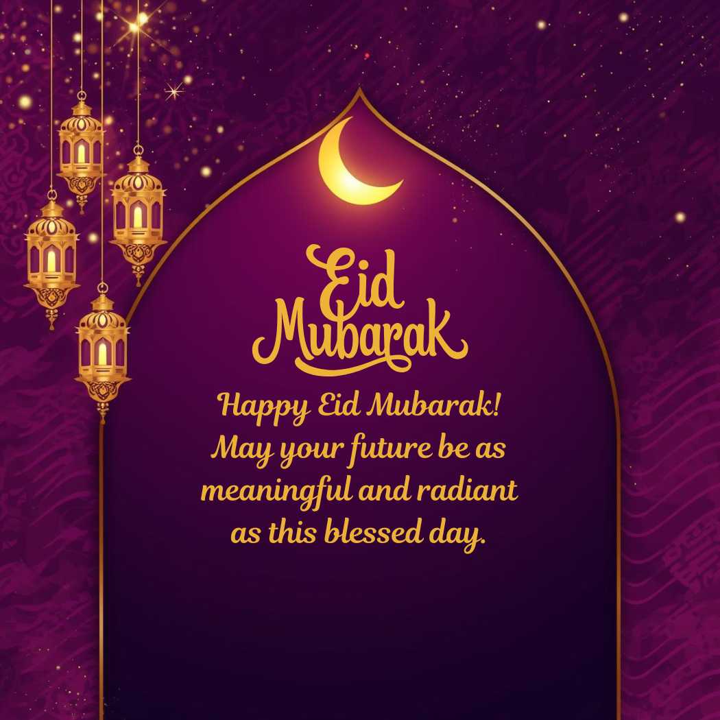 The Happy Eid Mubarak Wishes image showcases an elegant Eid Mubarak greeting card designed in a luxurious purple and gold theme, featuring a deep purple background with smooth flowing wave patterns and subtle Islamic geometric designs. A softly glowing golden crescent moon crowns the arch, while metallic gold lanterns hang gracefully on the upper left, casting a warm light across the scene. Gentle sparkles and bokeh effects add a festive, spiritual charm, and at the center appears the warm Eid wish: “Happy Eid Mubarak! May your future be as meaningful and radiant as this blessed day.”