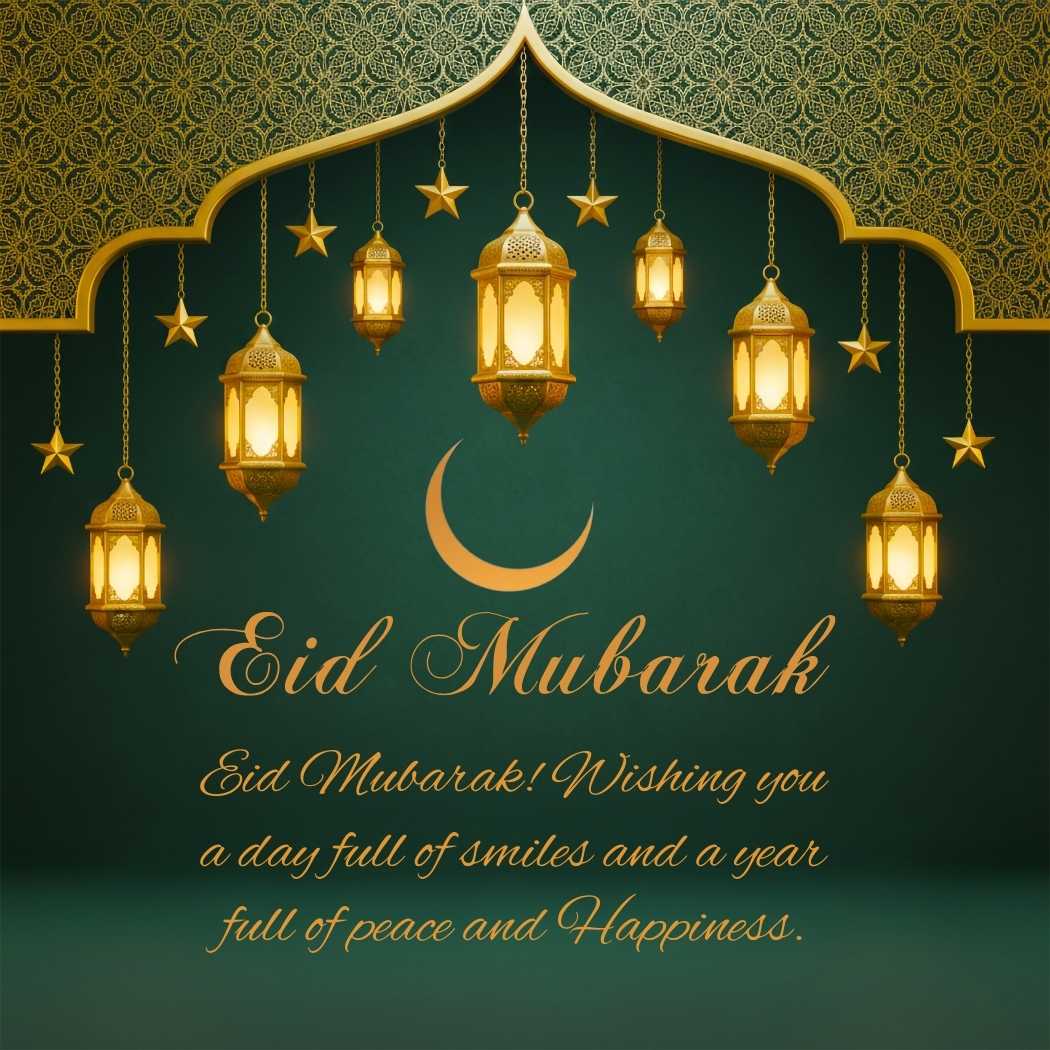 This Wishes for Eid Mubarak image features a festive Eid greeting background with a rich green backdrop, highlighted by a golden Islamic grille at the top, glowing golden lanterns, and a radiant crescent moon. The combination of gold and green creates a warm, elegant, and celebratory atmosphere. In the center, the cheerful wish appears: “Eid Mubarak! Wishing you a day full of smiles and a year full of peace and happiness.”