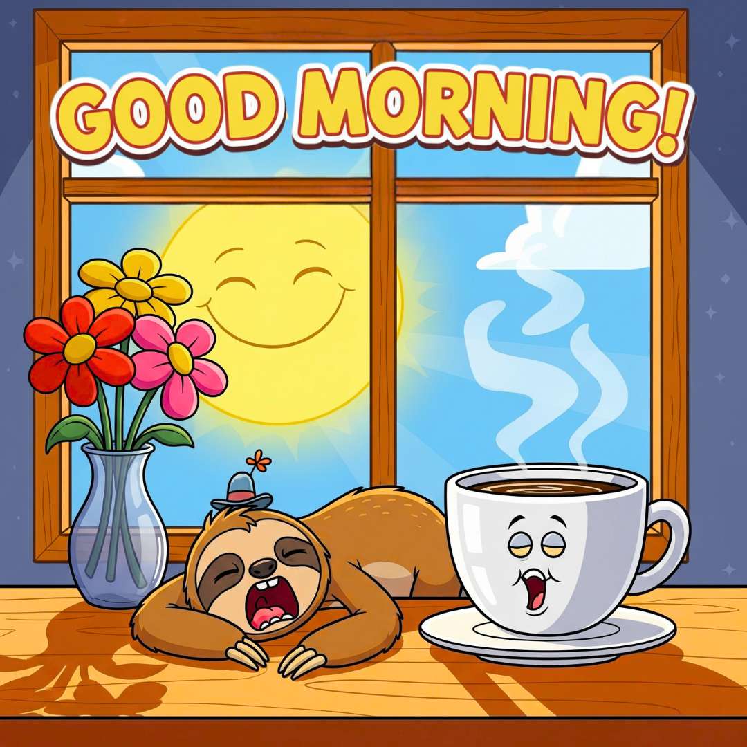This is the Best Funny Good Morning Image, featuring a sleepy sloth, the slowest animal in the world, dozing off peacefully while a steaming coffee cup also looks drowsy, adding to the humor. Meanwhile, the sun peeks through the window, gently trying to wake them up. The playful contrast between the sleepy characters and the bright morning light makes this scene both funny and adorable, perfect for sharing a lighthearted Good Morning greeting.