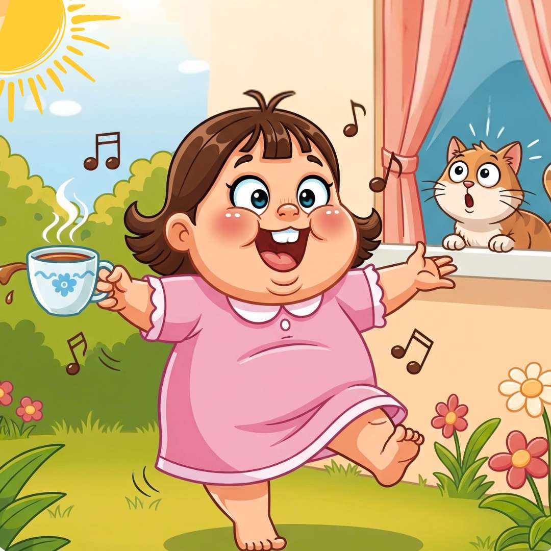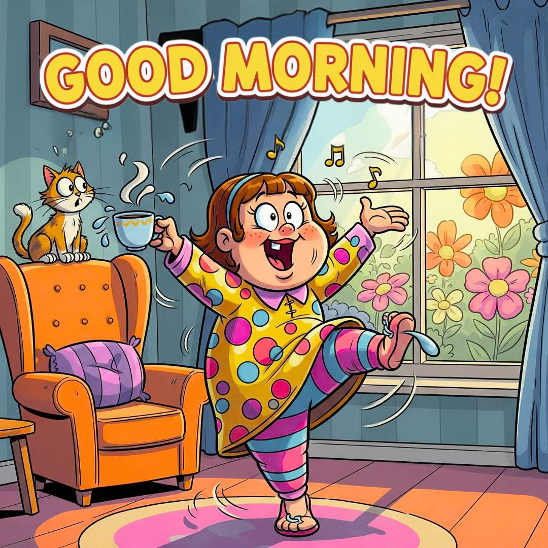 The Funny Good Morning scene shows a chubby, cheerful girl dancing and singing in the morning while holding a coffee cup, creating a playful and humorous vibe. A surprised cat watches her wide-eyed, adding extra comedy to the moment. Surrounded by bright flowers and a shining sun, the scene feels lively, funny, and full of morning joy — a perfect way to share a cheerful greeting.