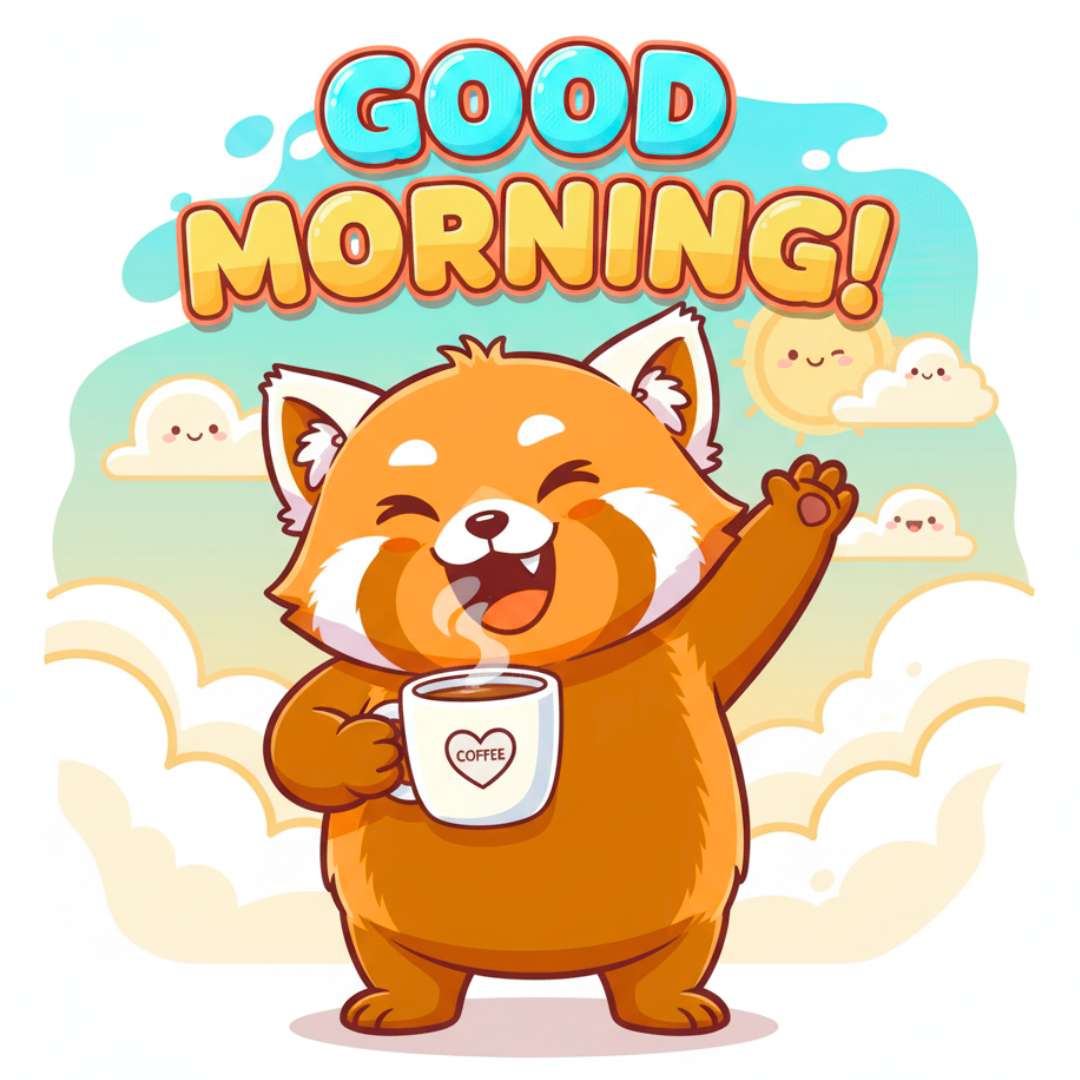 This Cute Funny Good Morning image features an adorable puppy sipping coffee in a sweet and playful pose, bringing instant smiles. The background is filled with soft clouds and a cheerful sun, creating a warm and happy morning vibe. The words “Good Morning” are written in a cute, stylish font, perfectly matching the lighthearted theme. This charming scene is ideal for sharing a cheerful and funny good morning greeting.