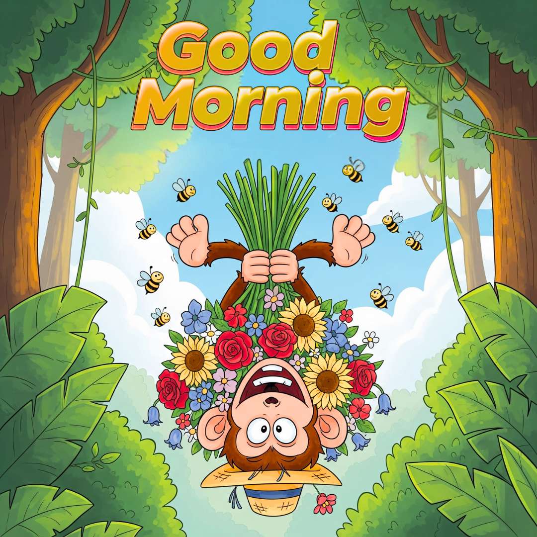 his Funny Good Morning Greeting features a playful monkey hanging upside down, holding a bunch of colorful flowers to make the scene extra funny and cheerful. The monkey’s silly expression and unusual pose add a lighthearted twist, while the bright flowers bring a fresh, lively vibe. Above the scene, “Good Morning” is written in a stylish font, making it a perfect image to share and spread smiles at the start of the day.