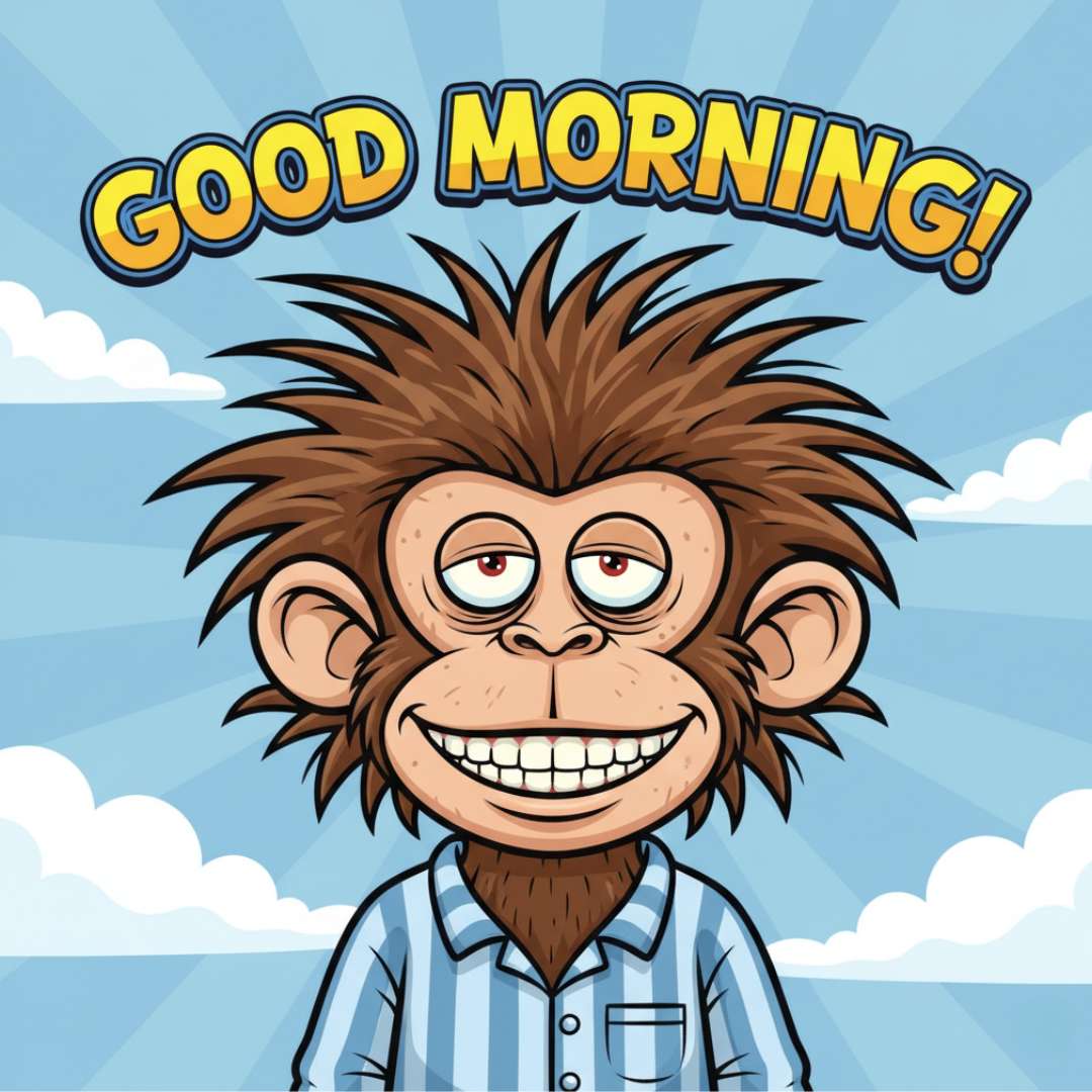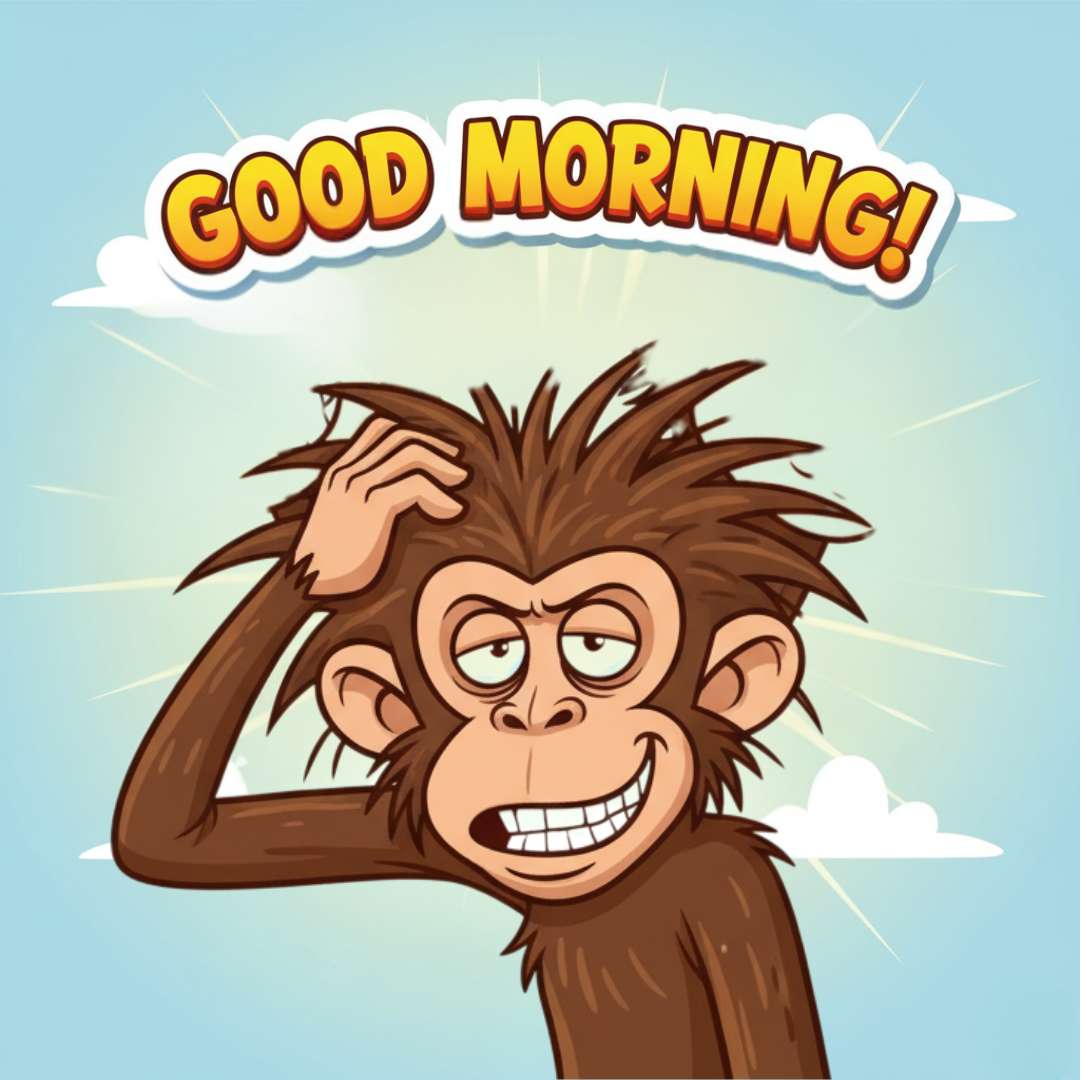 This Funny Good Morning for Friends features a goofy-faced monkey who looks like he’s just woken up, rubbing his head with sleepy eyes and a hilarious expression. Above him, “Good Morning” is written in a beautiful, stylish font, adding a cheerful touch. This funny and lighthearted image is perfect for sending to friends to bring a big smile to their faces and brighten their morning.