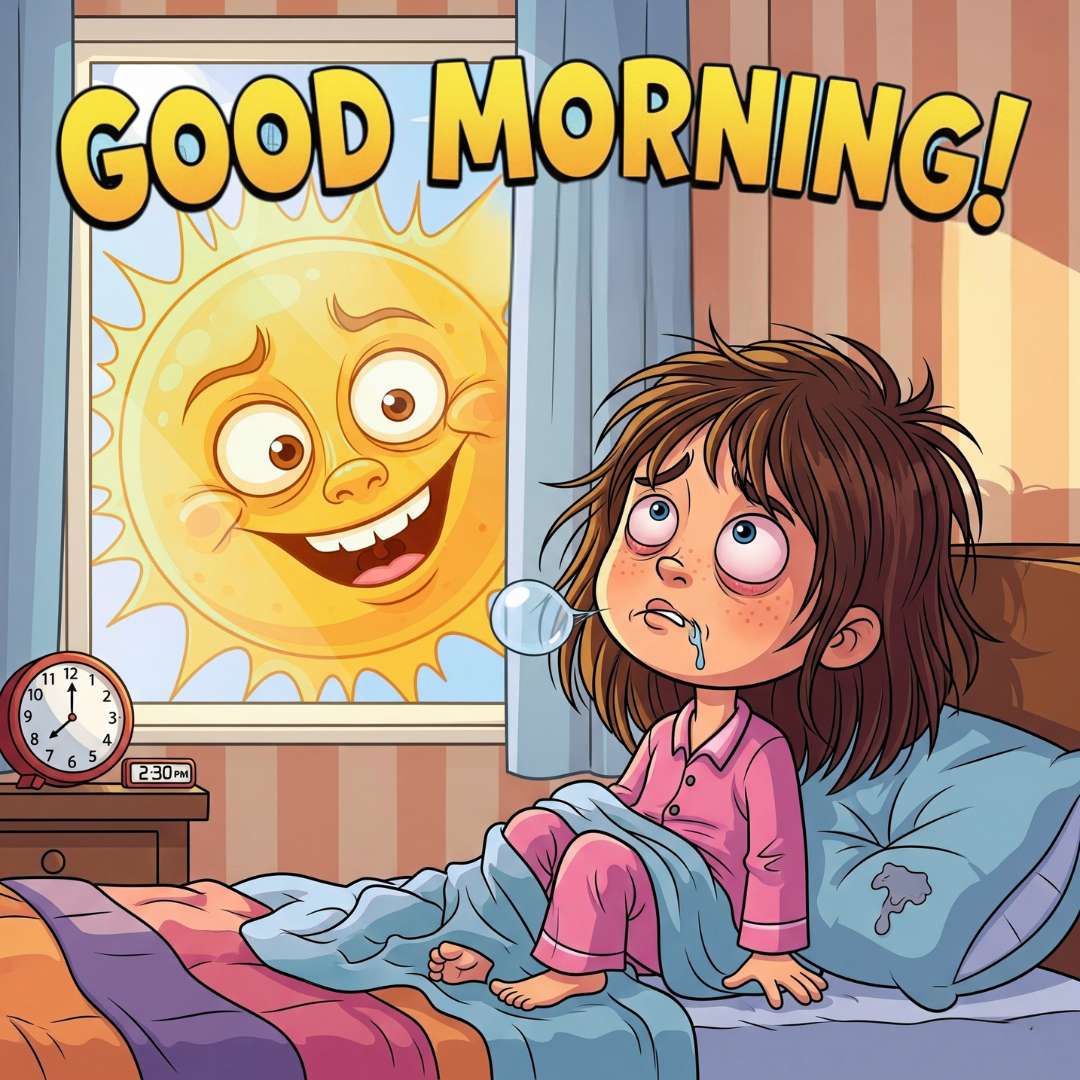 This Funny Good Morning Image features a cute-faced sun peeking through a window, trying to wake up a sleepy girl who clearly had a late night. The girl has red, tired eyes, messy hair, and a little drool at the corner of her mouth, creating a hilariously relatable morning scene. The playful sun’s cheerful expression contrasts perfectly with the girl’s exhausted look, making the image both funny and charming — a perfect way to share a lighthearted good morning greeting.