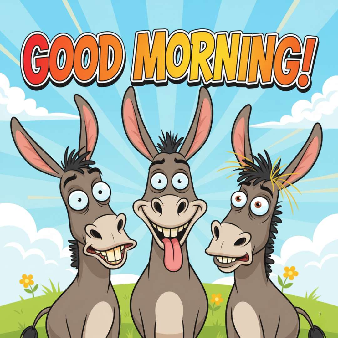 This Funny Good Morning Pic features a Good Morning message alongside three donkeys with hilariously goofy expressions, making the image instantly funny and eye-catching. Their silly faces add a playful vibe, making this Funny Good Morning perfect for sharing with friends, teams, or office colleagues to bring a smile and start the day with laughter.