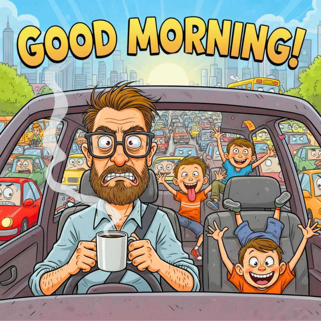 This Funny Good Morning Picture features an angry-faced dad sipping coffee while stuck in heavy traffic, trying to drop his kids off at school. Meanwhile, the kids in the car are going wild — making silly faces, jumping around, and doing all sorts of funny, chaotic things that are driving the dad crazy. His frustrated expression perfectly contrasts with the kids’ playful energy, creating a relatable and hilarious morning scene that’s perfect for sharing a lighthearted Funny Good Morning greeting.
