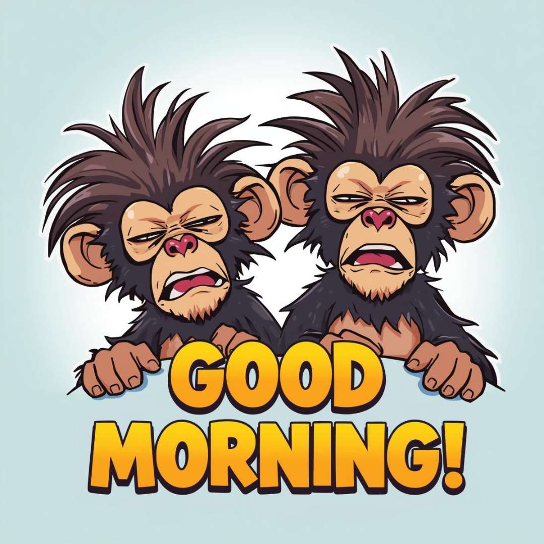 This Funny Good Morning to Share features two hilarious monkeys who look like they’ve just woken up, with half-open eyes and wide, sleepy mouths that create a perfectly funny morning expression. Above them, “Good Morning” is written in bold and beautiful font, adding a cheerful touch. The combination of their goofy faces and the playful design makes this image perfect for sharing a lighthearted Funny Good Morning greeting.